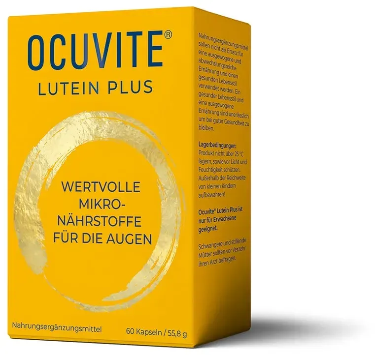 EAN: 4030571003236 - Nahrungsergänzungsmittel mit Zink zum Erhalt der normalen Sehkraft sowie Lutein und Zeaxanthin Ocuvite Lutein Plus ist ein Nahrungsergänzungsmittel, das dem Körper neben verschiedenen Vitaminen auch die Mikronährstoffe Lutein und Zeaxanthin zuführt. Das Produkt enthält Zink zum Erhalt der normalen Sehkraft und zusätzlich Vitamin C und E, damit oxidativer Stress und daraus resultierende schädliche Auswirkungen auf die Zellen gemindert werden. Das Produkt auf einen Blick: Nahrungsergänzungsmittel mit Vitaminen und Mikronährstoffen Nur für Erwachsene geeignet Täglich 2 Kapseln Frei von Konservierungsstoffen Zusätzliche Zufuhr von: Lutein und Zeaxanthin Vitamin C und E Omega-3-Fettsäuren Im Laufe unseres Lebens ist der menschliche Organismus permanenten Belastungen ausgesetzt, von denen auch das Auge betroffen ist. Neben Umweltfaktoren und Stress ist besonders der natürliche Alterungsprozess für die Beeinträchtigung der Sehkraft verantwortlich. Umso wichtiger ist es, den menschlichen Organismus gerade im fortgeschrittenen Alter mit ausreichend Vitaminen und Nährstoffen zu versorgen. Zusätzlich ist ein gesunder Lebensstil und eine ausgewogene Ernährung unerlässlich, um bei guter Gesundheit zu bleiben. Nahrungsergänzungsmittel können durch ihre ernährungsspezifischen und physiologischen Eigenschaften einen ergänzenden Beitrag zur Vermeidung eines Nährstoffdefizits und zur Gesundheitserhaltung leisten. SO FUNKTIONIERT S 1 mal täglich 2 Kapseln mit Wasser zu ... ![]() unsereklei neapotheke .de OCUVITE Lutein Plus Kapseln 60 St