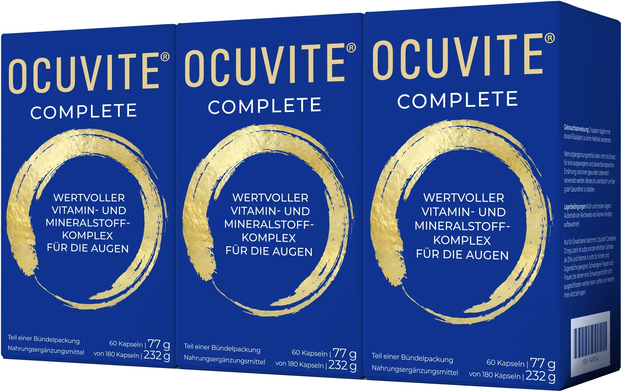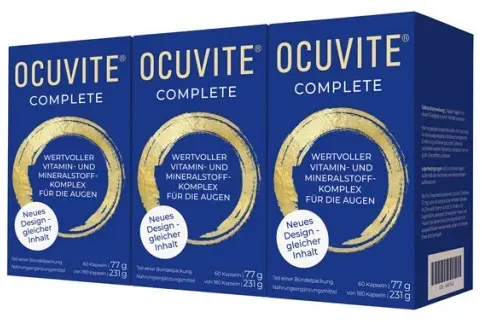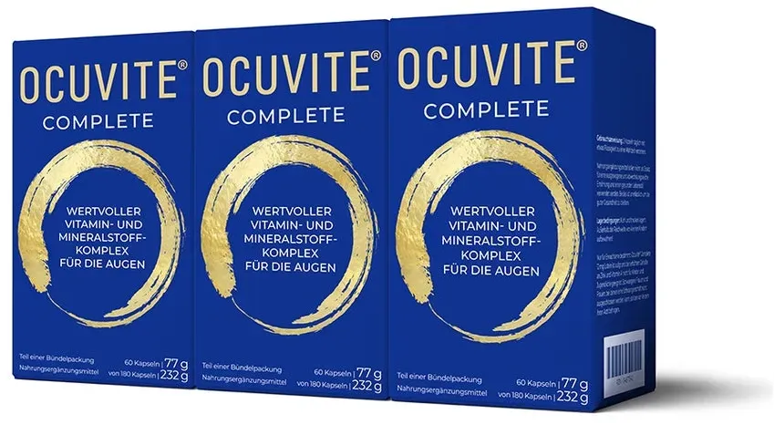 0,48 /St - Kategorie: Nahrungsergänzungsmittel - Bausch + Lomb - GTIN:4030571005704 - PZN:04871542 - Für ein langfristig starkes SehvermögenBei den OCUVITE Complete 12 mg Lutein Kapseln handelt es sich um ein Nahrungsergänzungsmittel mit Vitaminen und wertvollen Mineralstoffen wie z. B. Riboflavin (Vitamin B2), Zink, Vitamin A, Vitamin B6, Vitamin B12, Vitamin C, Vitamin E, Fischöl und Folsäure, die in Summe zum Erhalt der normalen Sehkraft beitragen. Anwendung:Täglich 2 Kapseln mit etwas kalter Flüssigkeit zu einer Mahlzeit einnehmen. Hinweis: Ocuvite Complete 12 mg Lutein ist auf Grund der erhöhten Gehalte an Zink und Vitamin A nur für Erwachsene geeignet. - 86,93 Euro bei medpex.de - gefunden von billiger.de Dieses Angebot für Bausch + Lomb Ocuvite Complete 180 St von DocMorris Apotheke ist eine weitere empfehlenswerte Option für die große Packung. ![]() ![]() Bausch + Lomb Ocuvite Complete 180 St