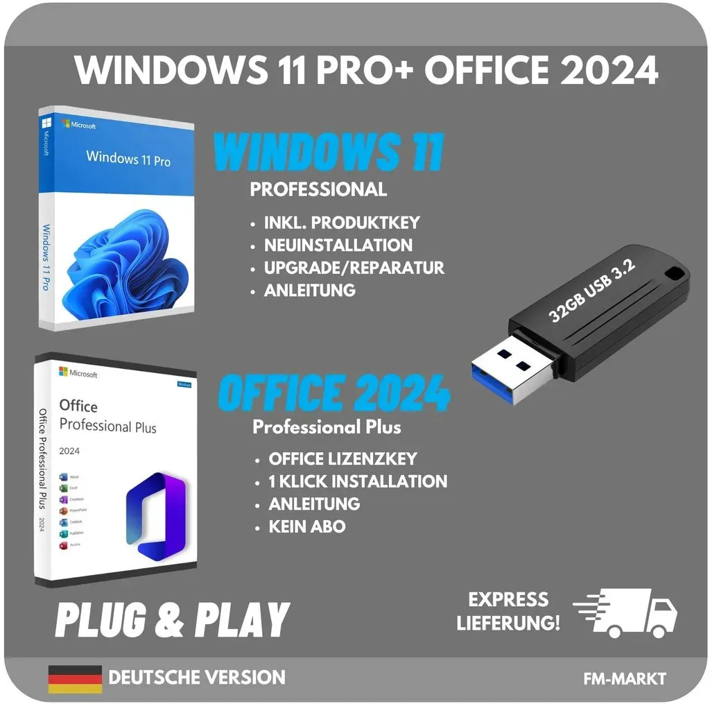 Kategorie: Office-Software - Microsoft - GTIN:9506863937251 - Windows 11 Professional + Microsoft Office 2024 Professional Plus Ihr Komplett-Paket für Produktivität & Leistung!Mit diesem Bundle-Set erhalten Sie Windows 11 Professional (inkl. Lizenzkey) und Microsoft Office 2024 Professional Plus(inkl. Lizenzkey)auf einem hochwertigen 32GB USB 3.2 Stick ideal für Neuinstallationen, Upgrades und Systemreparaturen. Dieses Set bietet Ihnen eine schnelle, sichere und einfache Lösung. Windows 11 Professional 64bit Das leistungsstarke Betriebssystem für moderne AnsprücheWindows 11 Pro bietet höchste Sicherheit, Geschwindigkeit und Effizienz, sowohl für den geschäftlichen als auch privaten Gebrauch.Original Lizenzschlüssel für die vollständige Aktivierung Neuinstallation oder Reparatur/Upgrade ideal für neue oder bestehende Systeme Benutzerfreundliches Design & optimierte Leistung Ideal für Gaming, Business & Home-Office Schritt-für-Schritt-Anleitung für eine einfache Installation Microsoft Office 2024 Professional Plus Die komplette Office-Suite für maximale ProduktivitätMit Office 2024 erhalten Sie alle wichtigen Anwendungen (Word, Excel, Outlook etc.) für Ihre täglichen Aufgaben perfekt für Arbeit, Studium oder Home-Office.Original Lizenzschlüssel 1-Klick-Installation einfache & schnelle Aktivierung Kein Abo Inklusive Detaillierte Installationsanleitung Plug & Play Schnelle Installation vom USB-StickDieses Softwarepaket wird auf einem hochwertigen 32GB USB 3.2 Stick geliefert, ... SoftMaker Office Professional 2024 für 109,95 Euro ist eine hervorragende, datenschutzfreundliche Alternative zu Microsoft Office mit voller Kompatibilität. ![]() ![]() SoftMaker Office Professional 2024
