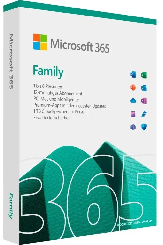 3 Händlerangebote bei billiger.de - Kategorie: Office-Software - Microsoft - Microsoft 365 Family: Teile die VorteileMicrosoft 365 Family ist das Abonnement von Microsoft für die Familie mit bis zu 6 Personen für . Mit diesem Paket hast du alle bekannten Programme von Microsoft wie Word, Excel, PowerPoint, Outlook und Teams. Du installierst das Programm, meldest dich mit deinem Konto an und schon ist die Software mit deinem Microsoft-Konto verbunden. Für jeden Nutzer kannst du auf bis zu 5 Geräten gleichzeitig angemeldet sein. Wenn du dich auf einem 6. Gerät anmelden möchtest, musst du dich zuerst auf einem anderen Gerät abmelden. Außerdem hat jeder Nutzer sein eigenes Konto und jeder Nutzer kann die Programme separat auf seinen eigenen Geräten installieren.Am Ende des Abo-Jahres entscheidest du, ob du es verlängern möchtest. Also keine automatische Erneuerung!Alle 365 Programme werden auf deinem Gerät installiert, sodass du es nach der Installation auch ohne Internetverbindung nutzen kannst. Du kannst sie auch auf einen anderen Computer übertragen, z. B. nach einem Absturz oder dem Kauf eines neuen Computers. Mit Microsoft 365 Family genießt du dank automatischer Updates immer die neueste Version aller Programme. Und dann ist da noch OneDrive. Der Cloud-Speicher von Microsoft, bei dem jeder Nutzer 1000 GB persönlichen Speicherplatz hat. Genug für alle deine Dateien!Kaufe Microsoft Office 365 bei Your.Software zum besten Preis mit unserer Tiefpreis . Außerdem liefern wir ... Ein sehr preiswertes Angebot, das 6 Nutzer für 12 Monate abdeckt und als PKC (Product Key Card) geliefert wird. ![]() ![]() Microsoft 365 Family 6 Benutzer 12 Monate PKC DE