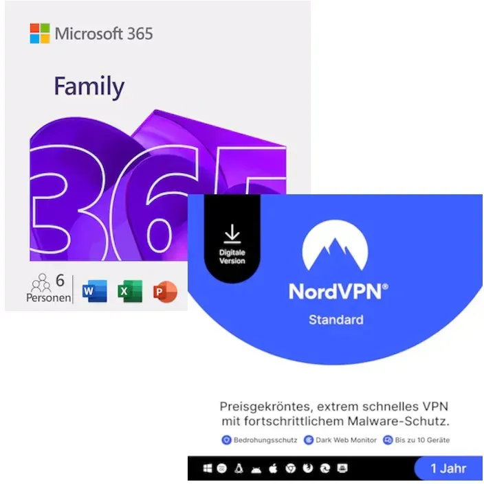 Kategorie: Office-Software - Microsoft - GTIN:0885370509571 - Microsoft 365 Family für 6 Personen / Word, Excel, PowerPoint, Outlook, uvm. / 6 TB zusätzlicher Cloud Speicher / Support während der kompletten Laufzeit / Vollversion für PC oder Mac für / inkl. NordVPN Standard für 10 Geräte - 114,99 Euro bei notebooksbilliger - gefunden von billiger.de Dieses Amazon-Angebot kombiniert Microsoft 365 Family mit WISO Steuer 2025, was für viele Nutzer eine praktische Ergänzung ist. ![]() ![]()