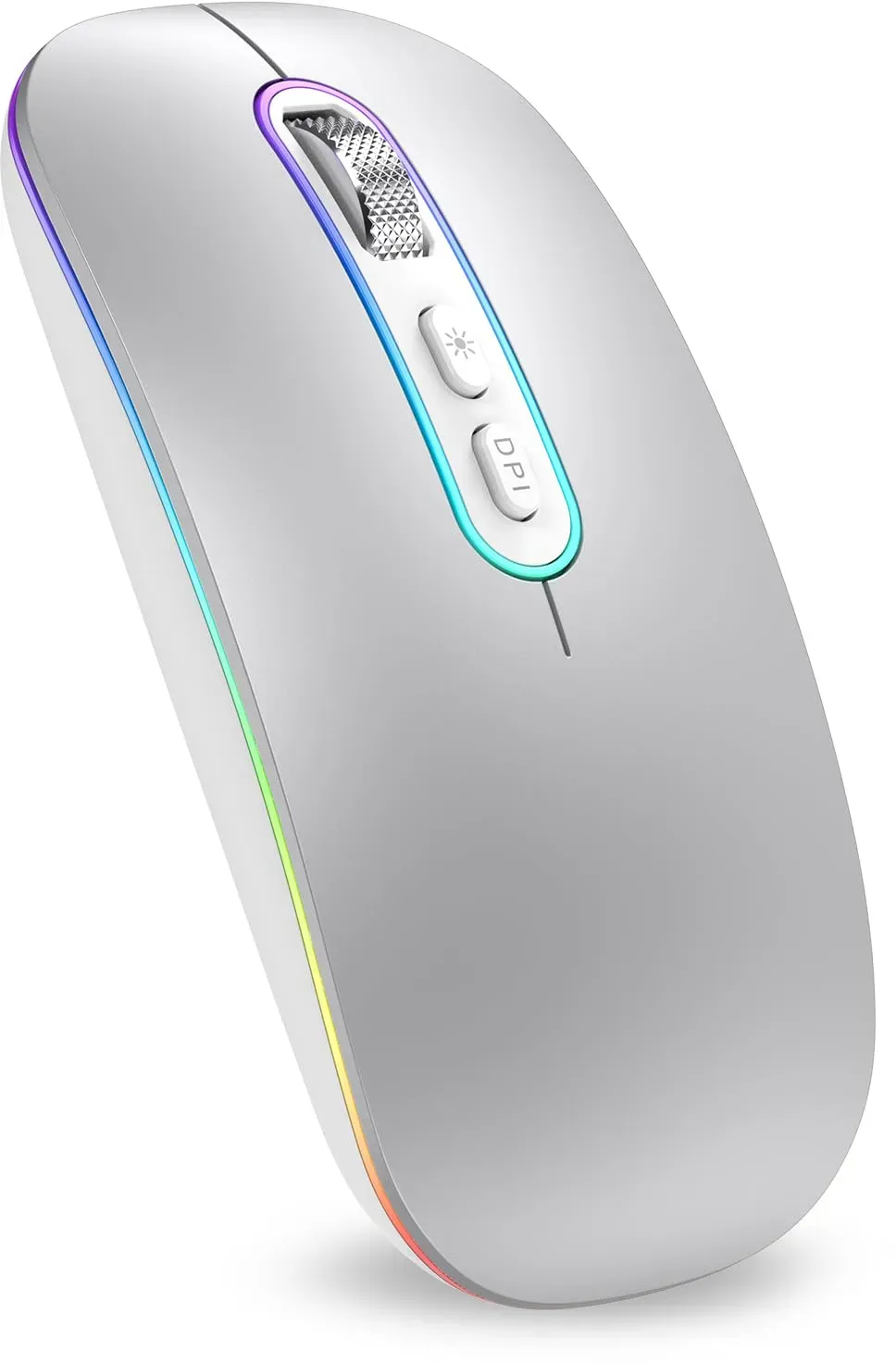 Kategorie: Mäuse - leapest - GTIN:6222066917236 - Dual Mode Bluetooth Mouse (BT 5.1 + 2.4GHz) Die kabellose Maus im Dual Mode ermöglicht den freien Wechsel zwischen zwei Geräten mit einer Maus durch einfaches Umschalten. Sie kann ein Gerät über Bluetooth und das andere über einen 2,4GHz USB-Empfänger verbinden. Hinweis: Sie können den Bluetooth-Modus und den 2,4G-Modus nicht gleichzeitig verwenden. 3 Einstellbare DPI-Stufen und Mute Click Zwischen 1000, 1200 und 1600, um verschiedene Bedürfnisse zu erfüllen. Spezielles geräuschloses Design der rechten und linken Taste, so dass Sie sich auf Arbeit oder Spiel konzentrieren können, ohne andere zu stören. Eingebaute Batterie und automatische Energiesparfunktion Die Maus hat eine eingebaute wiederaufladbare Batterie mit Ladekabel. Kein Batteriewechsel erforderlich. Energiesparendes Design, die Maus schläft nach 10 Minuten ohne Betrieb, sie kann durch Anklicken einer beliebigen Taste aufgeweckt werden. 7 Farb-RGB-Licht 7 verschiedene Farben ändern sich zufällig während des Gebrauchs, bieten beruhigende Beleuchtung und schaffen eine kühle und schicke Atmosphäre für Arbeit und Spiel. Weite Kompatibilität 2.4GHz-Modus funktioniert mit Laptop, Desktop oder jedem Gerät mit USB-Anschluss, schließen Sie einfach den USB-Empfänger an und spielen Sie direkt. Bluetooth-Modus funktioniert mit Windows/Android/MAC OS System. ( HINWEIS: BT5.1 Systemvoraussetzung: Windows 8.0, Windows 10 oder höher; MacOSX 10.10 oder höher; iPad OS 13 oder ... ![]() ![]() leapest Bluetooth Maus kabellos (Bluetooth 5.1 + USB 2,4 GHz) LED Dual Mode- Wiederaufladbare Optische Office Funkmaus für Laptop MacBook Air Pro,iPad,PC,Computer,Desktop, mouse mit USB C Adapter (Silber)