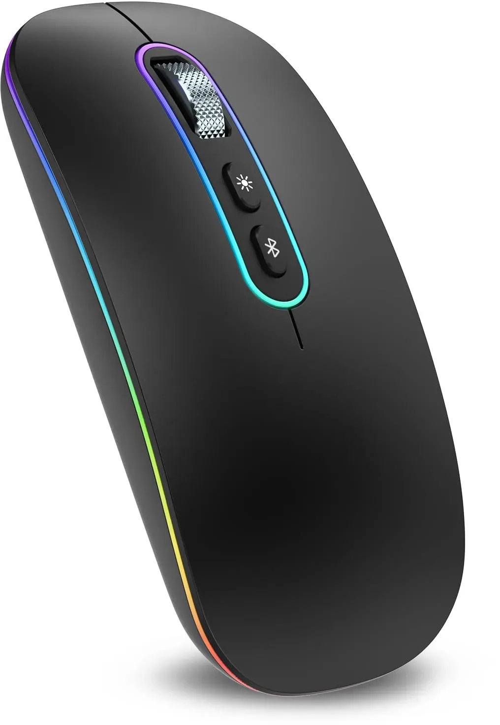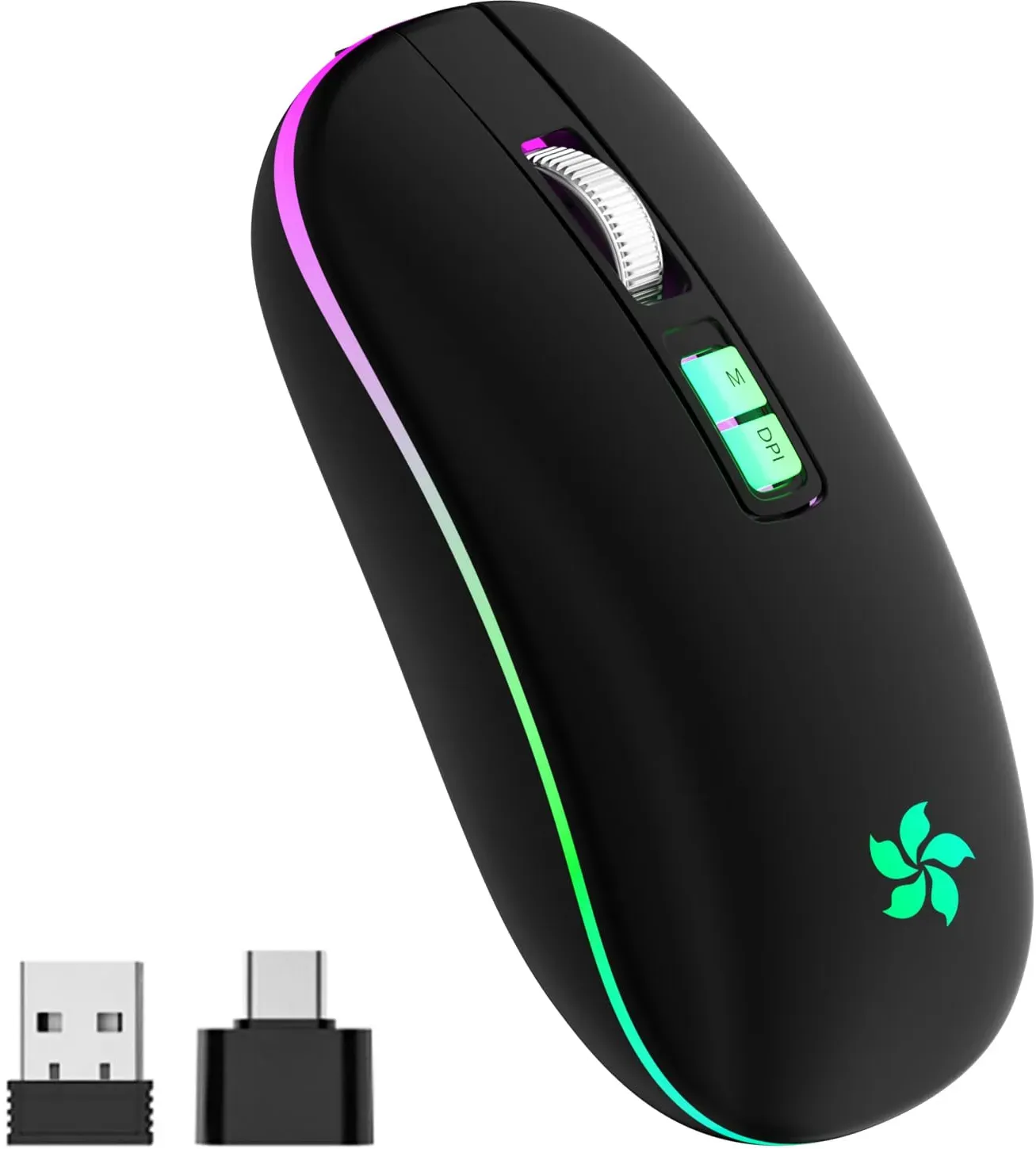 Kategorie: Mäuse - leapest - Dual Mode Bluetooth Mouse (BT 5.1 + 2.4GHz) Die kabellose Maus im Dual Mode ermöglicht den freien Wechsel zwischen zwei Geräten mit einer Maus durch einfaches Umschalten. Sie kann ein Gerät über Bluetooth und das andere über einen 2,4GHz USB-Empfänger verbinden. Hinweis: Sie können den Bluetooth-Modus und den 2,4G-Modus nicht gleichzeitig verwenden. 3 Einstellbare DPI-Stufen und Mute Click Zwischen 1000, 1200 und 1600, um verschiedene Bedürfnisse zu erfüllen. Spezielles geräuschloses Design der rechten und linken Taste, so dass Sie sich auf Arbeit oder Spiel konzentrieren können, ohne andere zu stören. Eingebaute Batterie und automatische Energiesparfunktion Die Maus hat eine eingebaute wiederaufladbare Batterie mit Ladekabel. Kein Batteriewechsel erforderlich. Energiesparendes Design, die Maus schläft nach 10 Minuten ohne Betrieb, sie kann durch Anklicken einer beliebigen Taste aufgeweckt werden. 7 Farb-RGB-Licht 7 verschiedene Farben ändern sich zufällig während des Gebrauchs, bieten beruhigende Beleuchtung und schaffen eine kühle und schicke Atmosphäre für Arbeit und Spiel. Weite Kompatibilität 2.4GHz-Modus funktioniert mit Laptop, Desktop oder jedem Gerät mit USB-Anschluss, schließen Sie einfach den USB-Empfänger an und spielen Sie direkt. Bluetooth-Modus funktioniert mit Windows/Android/MAC OS System. ( HINWEIS: BT5.1 Systemvoraussetzung: Windows 8.0, Windows 10 oder höher; MacOSX 10.10 oder höher; iPad OS 13 oder höher/ Android 5.0 oder ... ![]() ![]() leapest Bluetooth Maus kabellos (Bluetooth 5.1 + USB 2,4 GHz) LED Dual Mode- Wiederaufladbare Optische Office Funkmaus für Laptop MacBook Air Pro,iPad,PC,Computer,Desktop, mouse mit USB C Adapter (Schwarz)