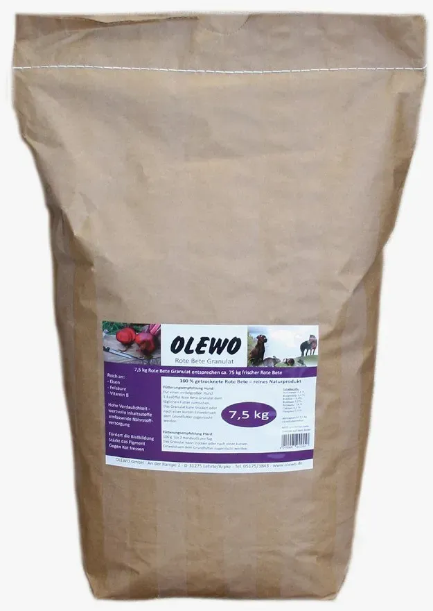 Zustand: Neu - 5,47 € / kg - Trockenfutter Trockenfutter für Hunde - Olewo - 334696 - EAN: 4019995242551 - Als Nahrungsunterstützung sind ihre besonderen Fähigkeiten bereits seit dem Mittelalter bekannt sehr schonend getrocknete Rote Bete ohne weitere Zusatzstoffe oder Aromen. ideales Ergänzungsfutter für Hund, Pferd ein guter Lieferant natürlicher Spurenelemented Nager - 9 Händler im amazon.de Marketplace ![]() ![]() Olewo Rote-Beete-Granulat 7,5 kg