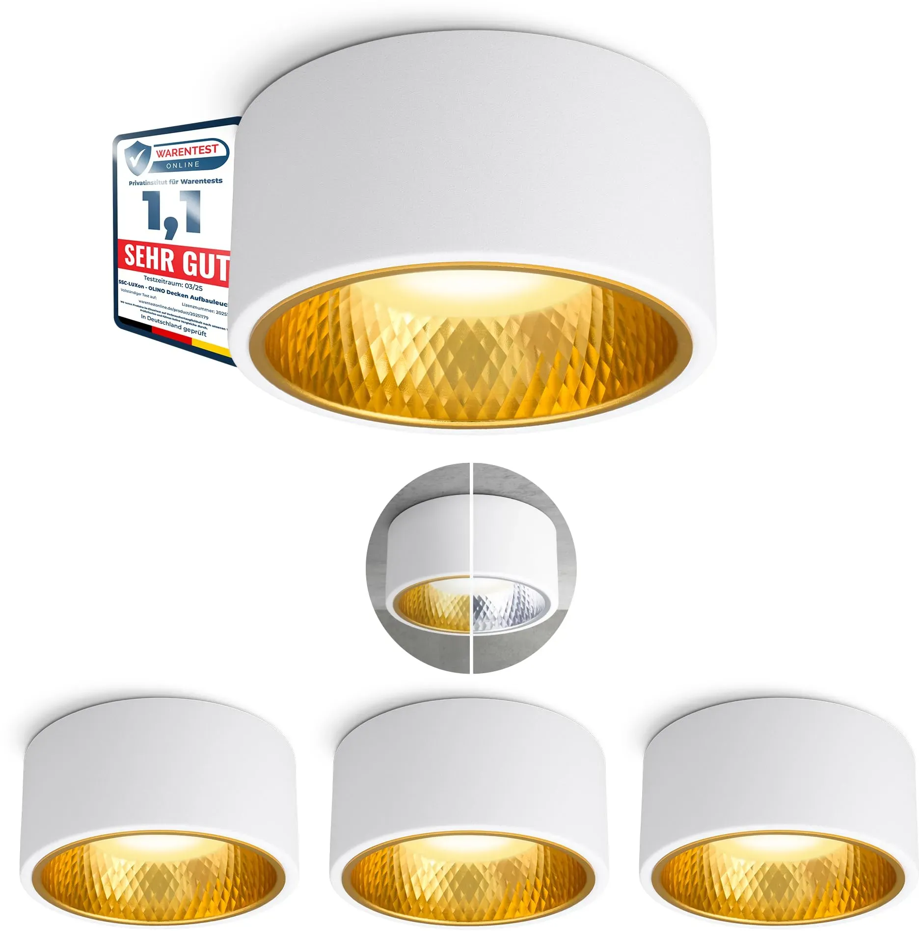 Zustand: Neu - 19,99 € / stück - Deckenspots - SSC-LUXon - OLINO 7394 - EAN: 4262409010370 - MODERNES DESIGN: Deckenlicht Aufputz OLINO mit wechselbaren Fronten in Gold und Silber, ideal als Deckenlicht oder Deckenleuchte Aufputz in Ihrem Zuhause EINFACHER ANSCHLUSS: Die Deckenspot Lampe lässt sich direkt an 230V anschließen, einfach zu installieren ohne zusätzliche Trafos. Fassung für je 1x GX53 ANWENDUNGSBEISPIELE: Vielseitig einsetzbar als Flur Deckenleuchte schwarz oder Küchenlampe Decke, ideal auch für Wohnzimmer oder Esstisch ANPASSPARE FRONT: Im Lieferumfang ist je eine silberne und eine goldene Blende zum Wechseln enthalten. Passen Sie den Look selbst an Lieferung ohne Leuchtmittel - Maße: Ø 150 x Höhe 60 mm - Material: Aluminium, Kunststoff - Fassung: 1x GX53 - Farbe: matt schwarz (pulverbeschichtet) - Verkäufer: SSC-LUXon GmbH im amazon.de Marketplace ![]() ![]() SSC-LUXon 4x OLINO Aufbauleuchte Deckenleuchte weiß wechselbare Front (gold oder silber) - Deckenspot neutralweiß LED GX53 230V