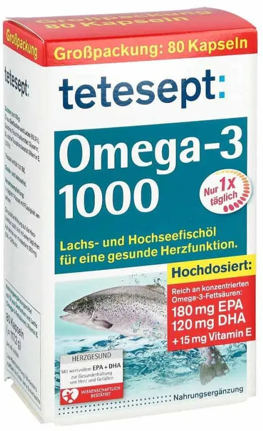 Vitamine, Mineralien & Nahrungsergänzungsmittel Gesundes Herz BAA Vitamine & Ergänzungen - EAN:6427416325451 - Omega 3 1000 mg, 60 Kapseln, Dobrovita Das Nahrungsergänzungsmittel mit Omega 3 1000 mg und Vitamin E 5 mg trägt zur ordnungsgemäßen Funktion von Herz und Gehirn bei. Verabreichungsmethode: 1-2 Kapseln pro Tag. Herkunftsland: EU, Lettland. Zutaten: Fischöl (mind. 30 % EPA&DHA), Vitamin E. Präsentation: 60 Kapseln. - gefunden von Kelkoo Tetesept ist eine vertrauenswürdige Marke und dieses Angebot ist eine gute Wahl im mittleren Preissegment. ![]() ![]() Tetesept Omega-3 1000 Kapseln