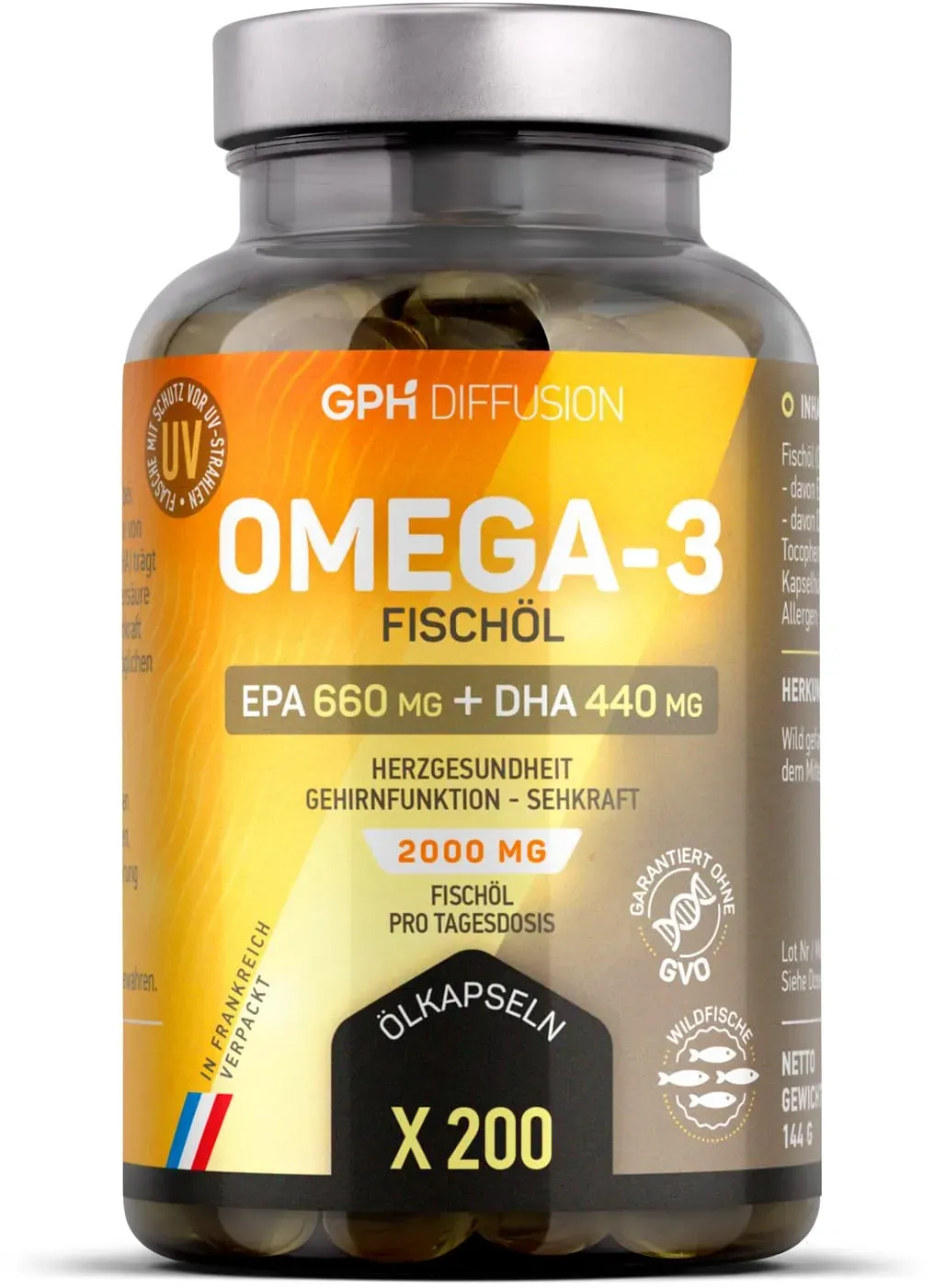 Dieses Angebot ist ein Beispiel für Angebote, die kürzlich auf dem eBay-Marktplatz in der Kategorie 180960 verfügbar waren. Bitte aktualisieren Sie die Suchergebnisse um aktuelle Angebote zu erhalten. ![]() ![]() Gph diffusion Omega 3 - Fischöl - 2000 mg pro Tagesdosis - EPA : 660 mg/DHA : 440 mg - Herz-kreislauf system, Vision, Gehirnfunktion - 200 kapseln