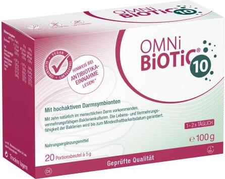 INSTITUT ALLERGOSAN Deutschland (privat) GmbH - EAN: 9120001433315 - Nahrungsergänzungsmittel mit BakterienkulturenOMNi BiOTiC 10 ist ein Nahrungsergänzungsmittel, das vor allem bei der Einnahme von Antibiotikum ergänzend eingenommen werden kann. Bei der Behandlung von Krankheiten mit Antibiotika können häufig übelkeit und Durchfälle auftreten.OMNi BiOTiC kann dem Körper, die im menschlichen Darm enthaltenen Bakterien zurückführen, die durch Antibiotika belastet werden. Es enthält pro Portion 5 Milliarden Darmbakterien aus 10 verschiedenen Stämmen. Anwendung:Während der gesamten Antibiotika-Therapie 2x täglich 1 Beutel in 1/8 Liter Wasser einrühren. Mindestens 1 Minute Aktivierungszeit abwarten, nochmals umrühren und dann trinken. Nach der Antibiotika-Therapie möglichst noch 14 Tage lang 1x täglich 1 Beutel einnehmen. - bei medpex.de - aus Yadore Produktdaten ![]() ![]() Omni Biotic 10, 20 St. Portionsbeutel,