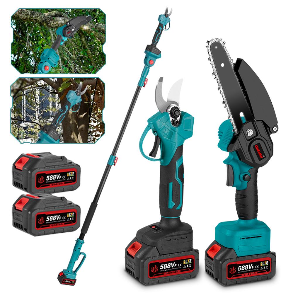 Auf Lager Versand durch AmazonONEVAN Akku Hochentaster und Astschere mit Teleskopstiel, 4-in-1, Bürstenlos 6 Zoll Akku Kettensäge + 25mm Akku Baumschere + 200mm Teleskopstange, 180° Einstellbarer Winkel, mit 2 4.0Ah Akkus