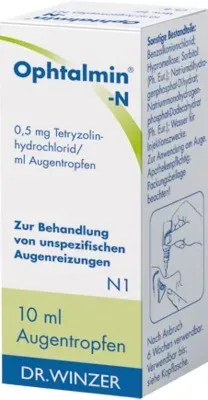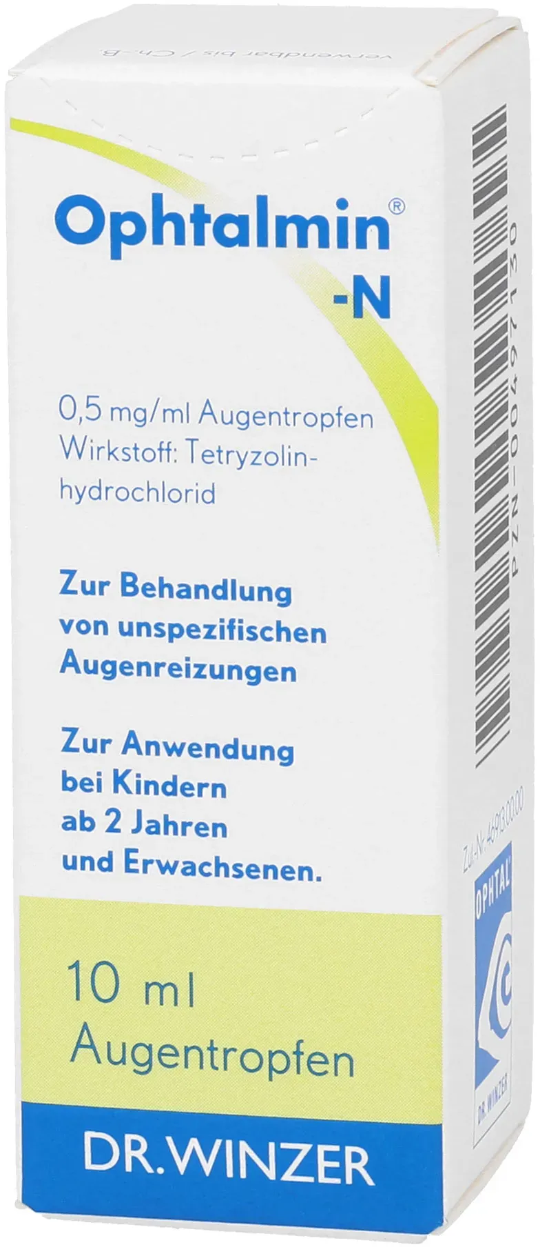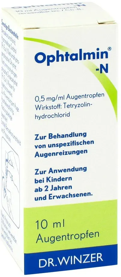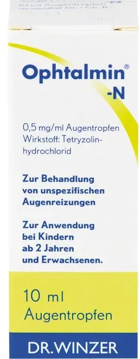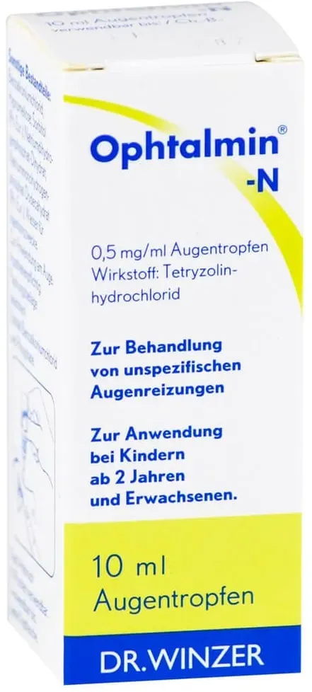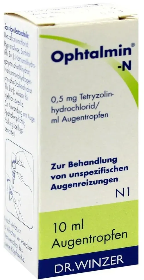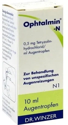 Kategorie: Arzneimittel - Ophtalmin - Wirkstoff: Tetryzolin bei gereiztem Auge Lösung zum Eintropfen in das Auge apothekenpflichtiges Arzneimittel (PZN: 00497130). Zu Risiken und Nebenwirkungen lesen Sie die Packungsbeilage und fragen Sie Ihren Arzt oder Apotheker. Hersteller: Dr. Winzer Pharma GmbH, Deutschland (Originalprodukt aus Deutschland) - 4,72 Euro bei Amazon Marketplace Health & Personal Care - gefunden von billiger.de ![]() ![]() Dr. Winzer Pharma GmbH Ophtalmin-N