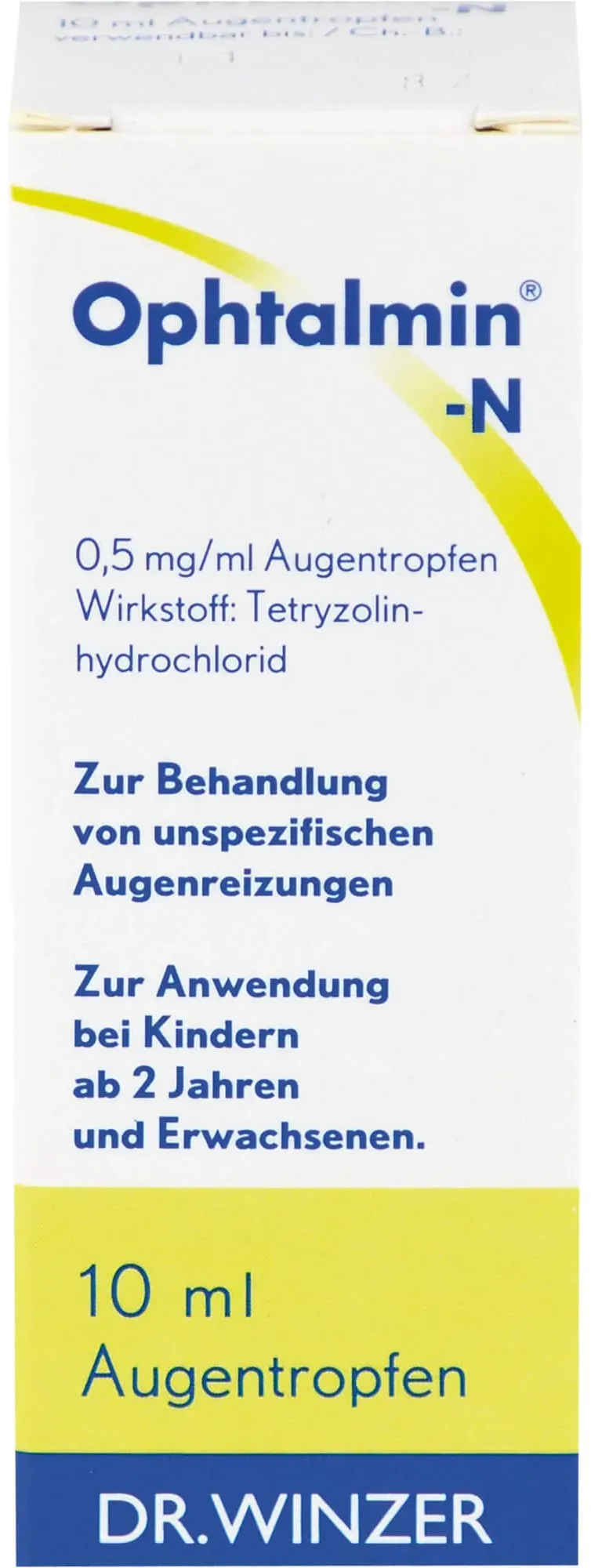 Ophtalmin n META PreisvergleichMit dem Meta-Preisvergleich suchen Sie gleichzeitig bei den großen Preisvergleich Portalen!Jetzt live Suche nach ophtalmin n starten! Ophtalmin n KaufberatungOphtalmin-N sind Augentropfen mit dem Wirkstoff Tetryzolin-Hydrochlorid, der durch Verengung der Blutgefäße eine schleimhautabschwellende Wirkung hat. Sie werden bei Augenreizungen durch Wind, Rauch, gechlortes Wasser, Licht oder allergische Entzündungen wie Heuschnupfen eingesetzt[1][3][4][5]. Wichtig bei der Anwendung: