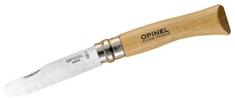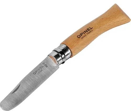 Die Klinge ist abgerundet, um Verletzungen zu minimieren. Ein Sicherungsring (Virobloc) verhindert, dass die Klinge unbeabsichtigt ein- oder ausgeklappt wird. Das Messer ist kein Spielzeug! Es sollte immer unter strenger Aufsicht von Erwachsenen verwendet werden. Der Griff besteht meist aus robustem Buchenholz, die Klinge aus rostfreiem Stahl (oft Sandvik 12C27M). ? Opinel Kindermesser No 07 natur Die Klingenlänge beträgt meist 7,5 cm, die Gesamtlänge ca. 17,5 cm - ideal für kleine Hände. Es gibt verschiedene Farben (rot, blau, grün, rosa, natur), was besonders bei Kindern beliebt ist. ? Beliebte Produktmerkmale und Modelle: