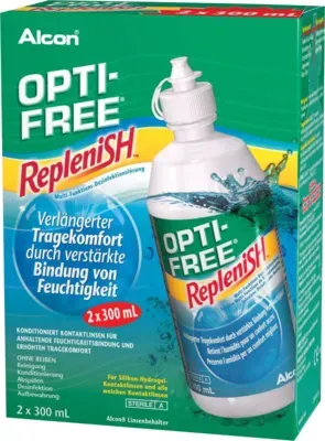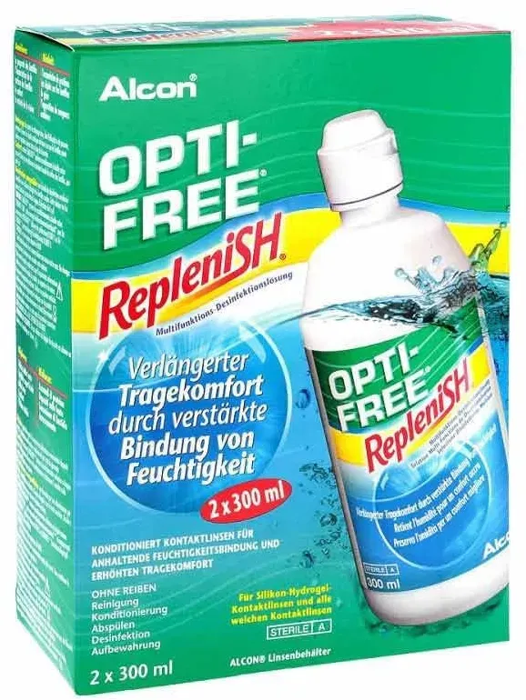 Zusammenfassung für die Kaufentscheidung: | Merkmal | Details | |--------------------------|------------------------------------------| | Produkttyp | Multifunktionale Kombilösung | | Inhalt | 2 x 300 ml | | Hersteller | Alcon | | Hauptwirkstoffe | Polyquad®, Aldox®, TearGlyde® | | Geeignet für | Weiche Kontaktlinsen, inkl. Silikon-Hydrogel | | Preisbereich | ca. 17 € bis 28 € für 2 x 300 ml | | Kundenbewertung | Durchschnittlich ca. 3,0 von 5 | | Vorteile | Gute Verträglichkeit, langanhaltende Feuchtigkeit, zuverlässige Reinigung | | Anwendung | Reinigen, reiben, abspülen, über Nacht einlegen | Wenn Sie Wert auf guten Tragekomfort, zuverlässige Desinfektion und eine bewährte Marke legen, ist Opti-Free Replenish 2 x 300 ml eine empfehlenswerte Wahl. Achten Sie beim Kauf auf seriöse Händler und vergleichen Sie Preise, um ein gutes Angebot zu finden. Für die direkte Suche und Preisvergleich können Sie z.B. nach Opti-Free Replenish 2 x 300 ml suchen. Jetzt live Suche nach opti-free replenish 2 x 300 starten! Opti-free replenish 2 x 300 Angebote aus dem beliebtesten Preisbereich*Durch Käufe über Links zu Händlern kann diese Website eine Provision erhalten, u.a. durch das eBay Partner Network und das AmazonPartnerNet![]() ![]() Opti-Free RepleniSH - (2x300ml)