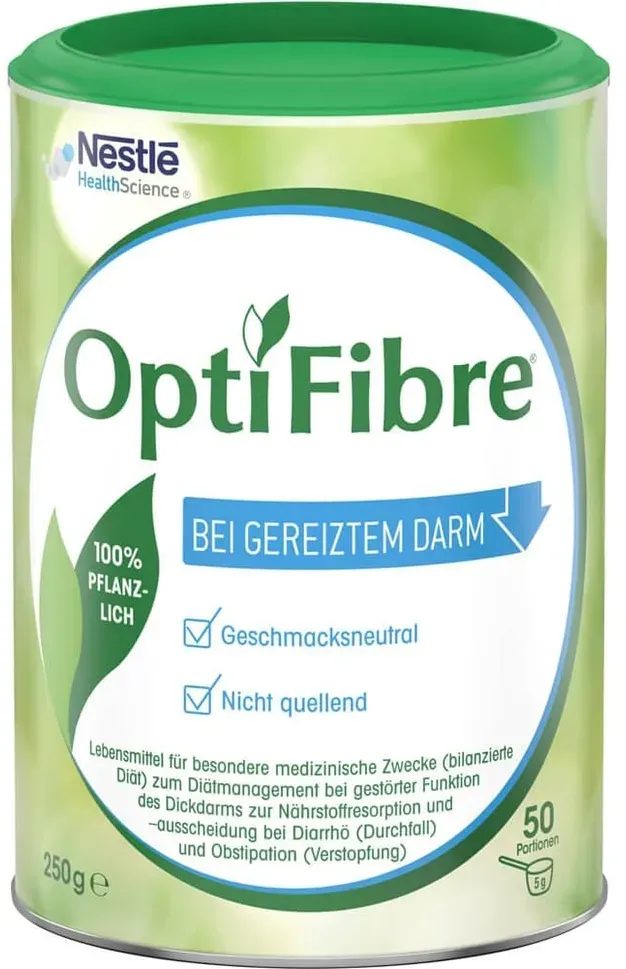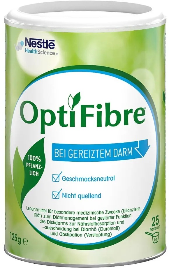 Nestle Health Science (Deutschland) GmbH - EAN: 7613035091580 - 100% lösliche BallaststoffeOptiFibre ist ein Lebensmittel für besondere medizinische Zwecke (Bilanzierte Diät) zum Diätmanagement bei gestörter Funktion des Dickdarms, zur Nährstoffresorption und -ausscheidung bei Diarrhö (Durchfall) sowie Obstipation (Verstopfung).OptiFibre besteht zu 100% aus löslichen Ballaststoffen aus Guarkernmehl. Diese Ballaststoffe dienen wichtigen Darmbakterien der Darmflora (z. B. Bifidobakterien, Lactobazillus) als Energiequelle.Das geschmacksneutrale Pulver kann in kalte oder warme Flüssigkeiten sowie pürierte Speisen eingerührt werden. Es löst sich vollständig in Getränken und Speisen auf, ohne Geschmack und Konsistenz zu beeinflussen. Auf eine ausreichende tägliche Flüssigkeitszufuhr und ausreichend Bewegung ist zu achten. - bei medpex.de - aus Yadore Produktdaten ![]() ![]() OPTIFIBRE Pulver, - 125 g eBay PZN 10832670