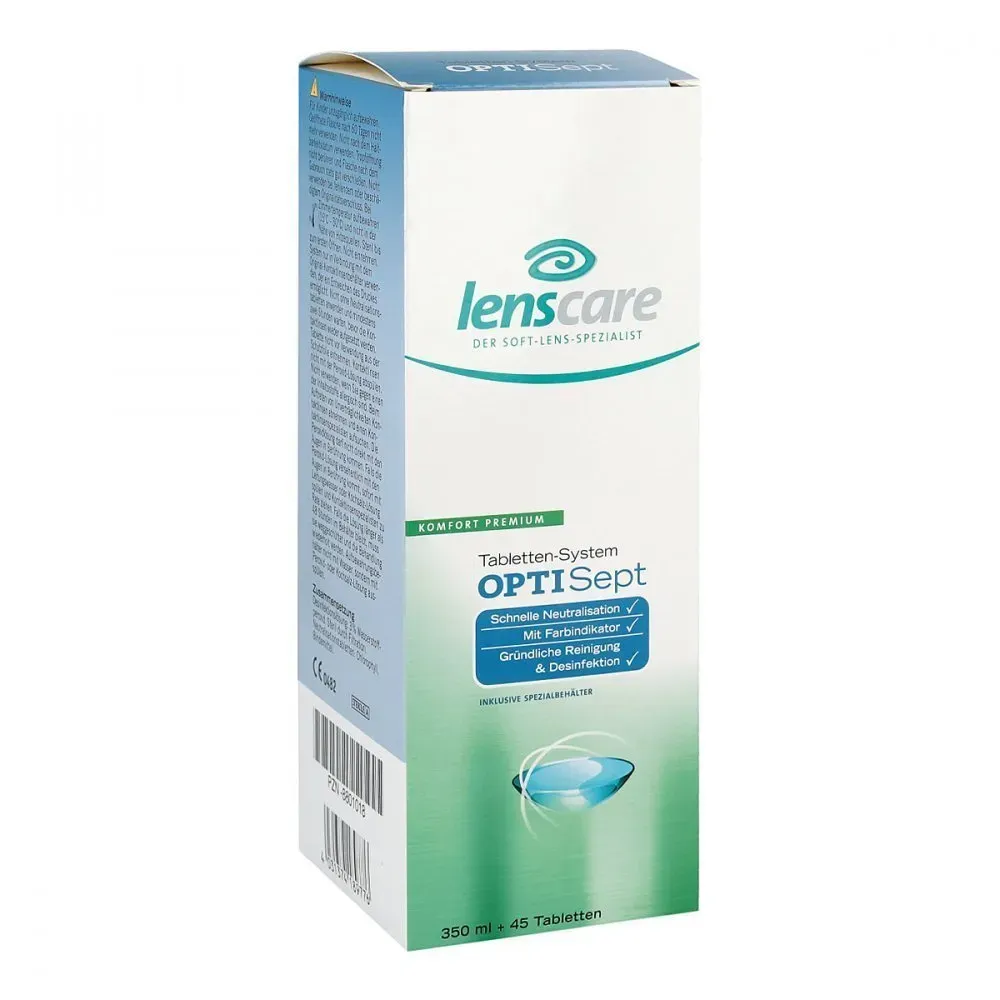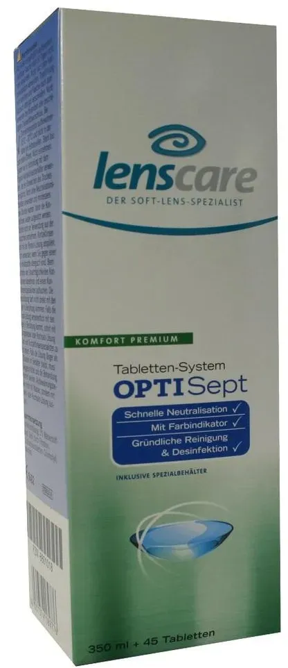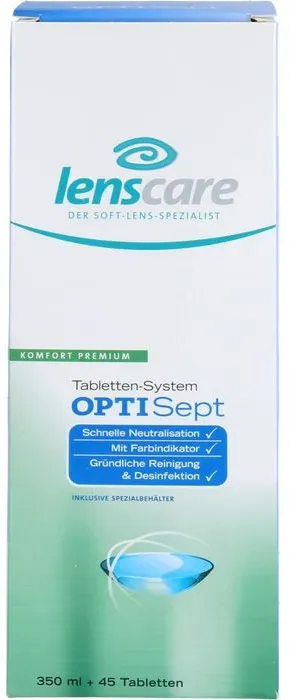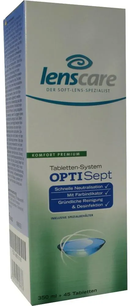 Kategorie: Zubehör für Kontaktlinsen - Lenscare - GTIN:4031374189776 - PZN:08801018 - Lenscare Optiset OPTISept ist das extra auf OPTI-System-Linsen abgestimmte Tabletten-System , das durch die Peroxid-Lösung besonders gründlich und schonend reinigt. Es ist sehr verträglich für die Augen, da keine Konservierungsstoffe enthalten sind! - Optimal für OPTI-System-Linsen - Nur 2 Std. Neutralisationszeit - Ohne Konservierungsstoffe 350 ml OPTISept Inkl. 45 Neutralisations-Tabs 1 Spezial-Behälter - 10,39 Euro bei Apotal - gefunden von billiger.de Medpex.de Polinelli S.R.L. Lenscare Optisept Kombip.350 ml+45 Tabl. 1 P