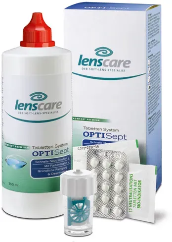 Kategorie: Zubehör für Kontaktlinsen - Lenscare - GTIN:4150088010180 - PZN:08801018 - Produkteigenschaften: Lenscare Tabletten-System OPTISept, inklusive Spezialbehälter Schnelle Neutralisation, mit Farbindikator, gründliche Reinigung und Desinfektion OPTISept Tabletten-System zur einfachen und gründlichen Pflege weicher Kontaktlinsen. Es handelt sich um ein komplettes Pflegesystem zum Reinigen und Desinfizieren. Es entfernt Protein-, Fett- und biologisch-organische Ablagerungen sowie Pilze. Mit Farbindikator, der die erfolgte Neutralisation anzeigt. Ohne Konservierungsstoffe. Inhalt der Packung: 350 ml OPTISept Peroxid-Lösung, 45 Tabletten und 1 Spezial-Kontaktlinsenbehälter Anwendung: Vor dem Anfassen der Kontaktlinsen Hände gründlich mit Wasser und Seife waschen. Kontaktlinsen in den Kontaktlinsenkorb legen. Behälter bis zur Markierung mit OPTISept Peroxid-Lösung füllen und eine Neutralisationstablette hinzugeben. Den Aufbewahrungsbehälter schließen und leicht schütteln. Die Kontaktlinsen müssen komplett mit OPTISept Peroxid-Lösung bedeckt sein. Stellen Sie den Behälter während der Neutralisation auf eine wasserfeste Unterlage. Die Lösung färbt sich innerhalb von zwei Stunden gelb ein. Somit ist die Neutralisation der Desinfektionslösung sichtbar. Mindestens zwei Stunden oder eine Nacht lang wirken lassen. Vor dem Aufsetzen der Kontaktlinsen Behälter leicht schütteln. Sie können die Kontaktlinsen nun direkt aufsetzen. Bei Bedarf vorher mit Kochsalzlösung abspülen. ... ![]() ![]() Lenscare Optisept Kombip.350 ml+45 Tabl. 1 P