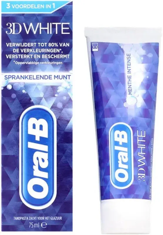 Kategorie: Zahnpflegeartikel - Oral-B - GTIN:8006540289570 - Oral-B 3D White Sparkling Mint Toothpaste (75 ml) gently removes up to 80% of surface stains while strengthening enamel and preventing new ones. With a 3-in-1 formula, it whitens, freshens breath, and protects teeth, gums, and tongue using natural peppermint extract for long-lasting freshness. - 2,49 Euro bei Joybuy - gefunden von billiger.de Eine preiswerte Einzelpackung der 3D White Zahncreme für den täglichen Gebrauch. ![]() ![]() Oral-B 3D WHITE Zahncreme, 75 ml, 1 Stück