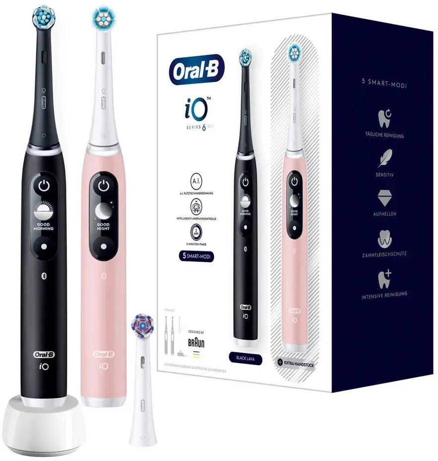 Verfügbarkeit: Sofort lieferbar, Lieferzeit max. 1-3 Werktage - Kategorie: Elektrische Zahnbürsten - Oral-B - GTIN:8006540841204 - €¢ Elektrische Zahnbürste (0.6 l Wasserbehälter) mit integriertem Li-Ion-Akku €¢ 5 Putzmodi €¢ Munddusche, 3D rotierend-pulsierend - 169,90 Euro bei computeruniverse.net - gefunden von billiger.de Dieses Duo-Pack von OTTO in Schwarz/Pink ist ideal für Paare oder als Ersatzgerät. ![]() ![]() Oral-B Elektrische Zahnbürste iO 6 + 2. Handstück - Black/Pink