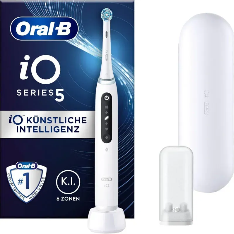 Elektrische Zahnbürsten C - EAN:4210201428695 - Hauptproduktbeschreibung Die elektrische Zahnbürste iO 5 nutzt die beste Technologie von Oral-B und kombiniert einen vom Zahnarzt inspirierten runden Reinigungskopf mit feinen Mikrovibrationsborsten für ein professionelles Reinigungsgefühl ganz bequem zu Hause. Der intelligente Drucksensor verhindert, dass Ihr Zahnfleisch zu stark oder zu sanft gereinigt wird. Die Bürstenerkennungstechnologie mit künstlicher Intelligenz erkennt Ihren Putzstil und führt Sie jeden Tag zu besseren Ergebnissen. Verbindet sich mit der kostenlosen Oral-B-App zur Reinigungsverfolgung und Echtzeitführung durch 6 Putzzonen. Um optimale Ergebnisse zu erzielen, ersetzen Sie den Oral-B iO-Bürstenkopf alle 3 Monate. - gefunden von Kelkoo Dieses Premium-Modell der iO Series 10 bietet die fortschrittlichsten Funktionen für eine optimale Mundhygiene. ![]()