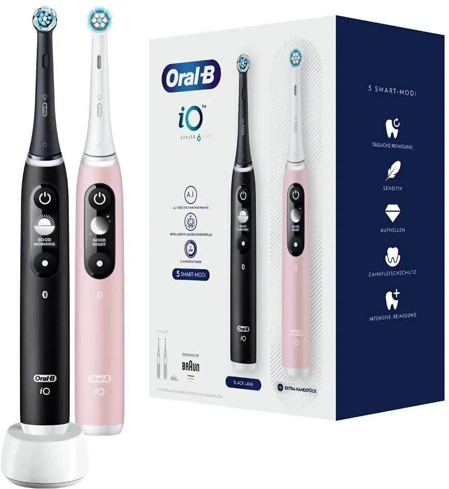 Kategorie: Elektrische Zahnbürsten - Oral-B - GTIN:4210201410157 - Die beste Reinigung von Oral-B dank revolutionärer Magnet-Technologie für ein extra leises und sanftes Putzerlebnis Entwickelt für Menschen mit empfindlichen Zähnen - 100 Prozent gesünderes Zahnfleisch in 1 Woche dank des einzigartigen runden Bürstenkopfes von Oral-B und sanften Mikrovibrationen Interaktives Display ermöglicht personalisiertes Coaching für verbesserte Putzergebnisse und erinnert an den Bürstenkopfwechsel Nie mehr einen Bereich vergessen: Künstliche Intelligenz erkennt den individuellen Putzstil und hilft, alle Zähne gleichmäßig zu reinigen 5 Smart-Putzprogramme für personalisiertes Putzen: Tägliche Reinigung, Sensitiv, Zahnfleischschutz, Intensive Reinigung und Aufhellen Extra Zahnfleischschutz dank intelligenter Andruckkontrolle: Leuchtet grün bei optimalem Druck und warnt mit rotem Licht vor zu viel Druck Lieferumfang: 2 iO 6 elektrische Zahnbürsten mit 1 Aufsteckbürste Sanfte Reinigung und 1 Aufsteckbürste Ultimative Reinigung, Ladestation - 215,99 Euro bei Amazon Marketplace Automotive - gefunden von billiger.de ![]() ![]() Oral-B iO Series 6 Plus Edition Elektrische Zahnbürste, Doppelpack ? Electric Toothbrush, Inkl. 4 Aufsteckbürsten, 5 Putzmodi für Zahnpflege, Reise-Etui, Designed by Braun ? Schwarz/Rosa