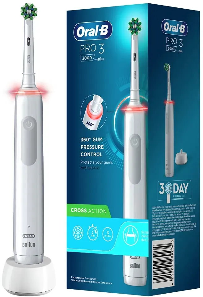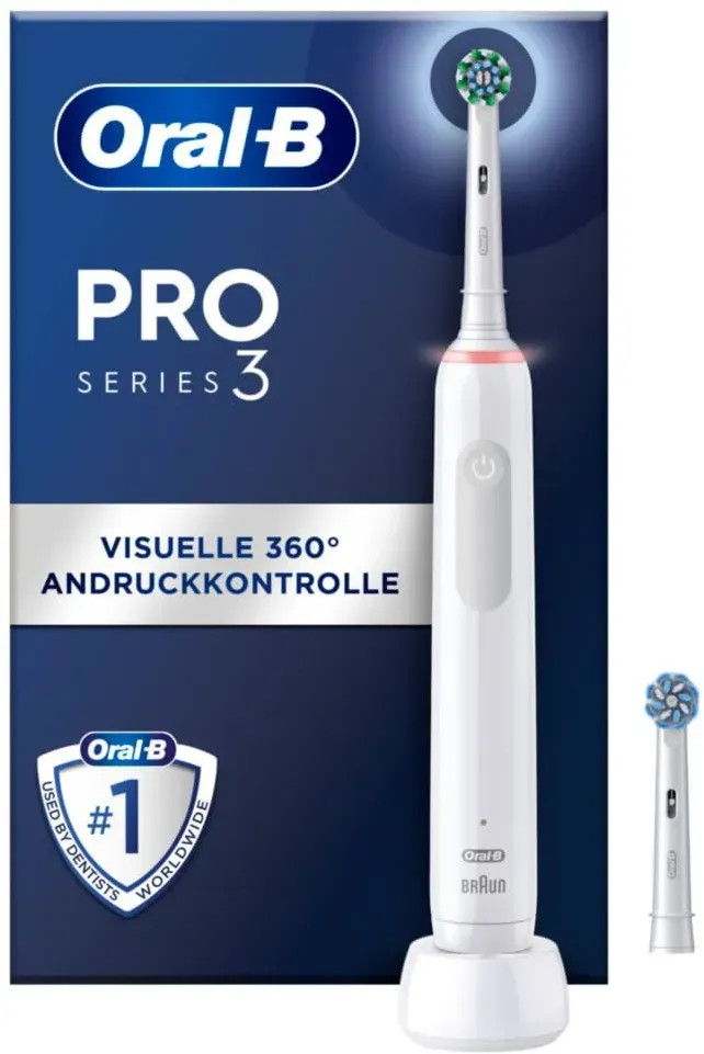 Zustand: Gebraucht - Rotierend Rotierende elektrische Zahnbürsten - Oral-B Procter & Gamble - 8006540760918 - EAN: 8006540760918 - RUND REINIGT BESSER und verhindert Zahnprobleme, bevor Sie entstehen ENTFERNT BIS ZU 100 PROZENT MEHR PLAQUE, selbst an schwer erreichbaren Stellen, für GESÜNDERES ZAHNFLEISCH - mit der runden 3in1 Technologie von Oral-B SCHÜTZT DAS ZAHNFLEISCH mit dem Sensitiv-Modus und der 360° ANDRUCKKONTROLLE, die rot leuchtet, wenn zu fest geputzt wird REINIGUNG PERFEKTIONIEREN mit 3 Putzprogrammen und einem integrierten 4-Zonen Timer, um die von Zahnärzten empfohlene Putzzeit von 2 Minuten einzuhalten FÜR JEDES BEDÜRFNIS DER RICHTIGE: Personalisiertes Zähneputzen mit den passenden Oral-B Bürstenköpfen z. B. Tiefenreinigung, Sensitive Clean oder 3DWhite Die RUNDEN BÜRSTENKÖPFE von Oral-B erreichen die Stellen, die längliche Handzahnbürsten nicht erreichen - die Zahnbürstenmarke Nr. 1, die Zahnärzte weltweit am häufigsten selbst verwenden ZUVERLÄSSIGER, LANGLEBIGER LITHIUM-IONEN AKKU mit LED Ladestandanzeige für optimales Zähneputzen zu jeder Zeit Ganz einfach ZU ORAL-B WECHSELN und die elektrische Zahnbürste dank 30 TAGE GELD-ZURÜCK- risikolos testen, Geschäftsbedingungen auf der Oral-B Website - 6 Händler im amazon.de Marketplace Ein sehr preiswertes Angebot, das die CrossAction-Variante mit zwei Aufsteckbürsten kombiniert. ![]() ![]() Oral-B Pro 3 3000 CrossAction weiß + Aufsteckbürste 2 St.