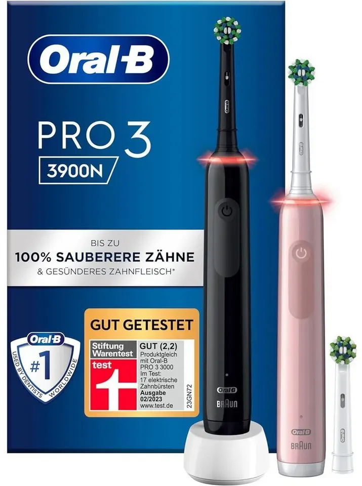 Zahnpflege Mode Beauty Gesundheit Gesichtspflege - - 2 Oral-B Pro 3 3900 Duo Elektrische Zahnbürsten - Ihre professionelle Zahnpflege im DoppelpackErleben Sie eine gründliche und effektive Zahnpflege mit dem Oral-B Pro 3 3900 Duo Set. Dieses Set bietet Ihnen zwei Elektrische Zahnbürsten, die Ihre tägliche Mundhygiene auf das nächste Level heben.Effektive ReinigungstechnologieDie Oral-B Pro 3 3900 Duo verwendet Mikrovibrationen, um Plaque und Verfärbungen gründlich zu entfernen. Diese innovative Reinigungstechnik sorgt für eine überlegene Zahnreinigung im Vergleich zu herkömmlichen Handzahnbürsten. Mit drei verschiedenen Leistungsstufen können Sie die Reinigung individuell an Ihre Bedürfnisse anpassen.Praktische Funktionen für eine optimale MundhygieneDas Set enthält zwei Handstücke in den Farben rosa und schwarz, sodass Sie und Ihr Partner jeweils eine eigene Zahnbürste nutzen können. Die austauschbaren Bürstenköpfe sorgen für eine langfristige Nutzung. Ein integrierter Timer hilft Ihnen, die empfohlene Putzdauer von zwei Minuten einzuhalten, während die Andruckkontrolle sicherstellt, dass Sie Ihr Zahnfleisch nicht zu stark belasten.Benutzerfreundlichkeit und AkkubetriebDie elektrische Zahnbürste ist akkubetrieben und bietet Ihnen somit maximale Bewegungsfreiheit. Eine volle Ladung reicht für mehrere Anwendungen, sodass Sie sich keine Sorgen um häufiges Aufladen machen müssen. Die mitgelieferte Ladestation sorgt dafür, dass Ihre Zahnbürsten immer einsatzbereit ... Dieses Duo-Pack in Schwarz/Rosa für 67,99 Euro ist ein gutes Angebot für zwei Zahnbürsten mit ansprechendem Design. ![]() ![]() Oral-B 3900 - Pro 3 eBay Edition schwarz + rosa Elektrische Zahnbürste mit 2 Handstück