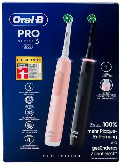 Kategorie: Elektrische Zahnbürsten - Oral-B - GTIN:8006540760277 - Elektrische Zahnbürste Pro 3 3900 Duo 2 Stück, Lieferumfang: 2 elektrische Zahnbürsten / 3 Zahnbürstenaufsätze / Ladestation, Catering & Haushalt/Haushaltsgeräte/Elektrische Zahnbürsten - 68,18 Euro bei OTTO Office - gefunden von billiger.de Dieses Duo-Pack in Black/Pink für 68,50 Euro ist eine solide Wahl mit einem guten Preis für zwei Geräte. ![]() ![]()