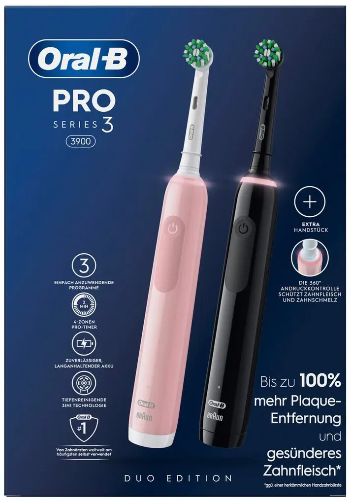Der angezeigte Preis könnte seit dem letzten Update gestiegen sein - EAN: 8006540760277 - Elektrische Zahnbürste »Pro 3 3900 Duo« 2 Stück, Lieferumfang: 2 elektrische Zahnbürsten / 3 Zahnbürstenaufsätze / Ladestation, Catering Haushalt/Haushaltsgeräte/Elektrische Zahnbürsten - Zustand: NEW - bei OTTO Office - gefunden von Buycentral Dieses Doppelpack ist ideal für Paare und bietet zwei wiederaufladbare Griffe mit Drucksensor. ![]() ![]() Oral-B Pro 3 3900 Elektrische Zahnbürste, 2 Stück, mit 2 wiederaufladbaren Griffen, Braun-Technologie, 2 Ersatzköpfe, sichtbarer Drucksensor, Rosa/Schwarz
