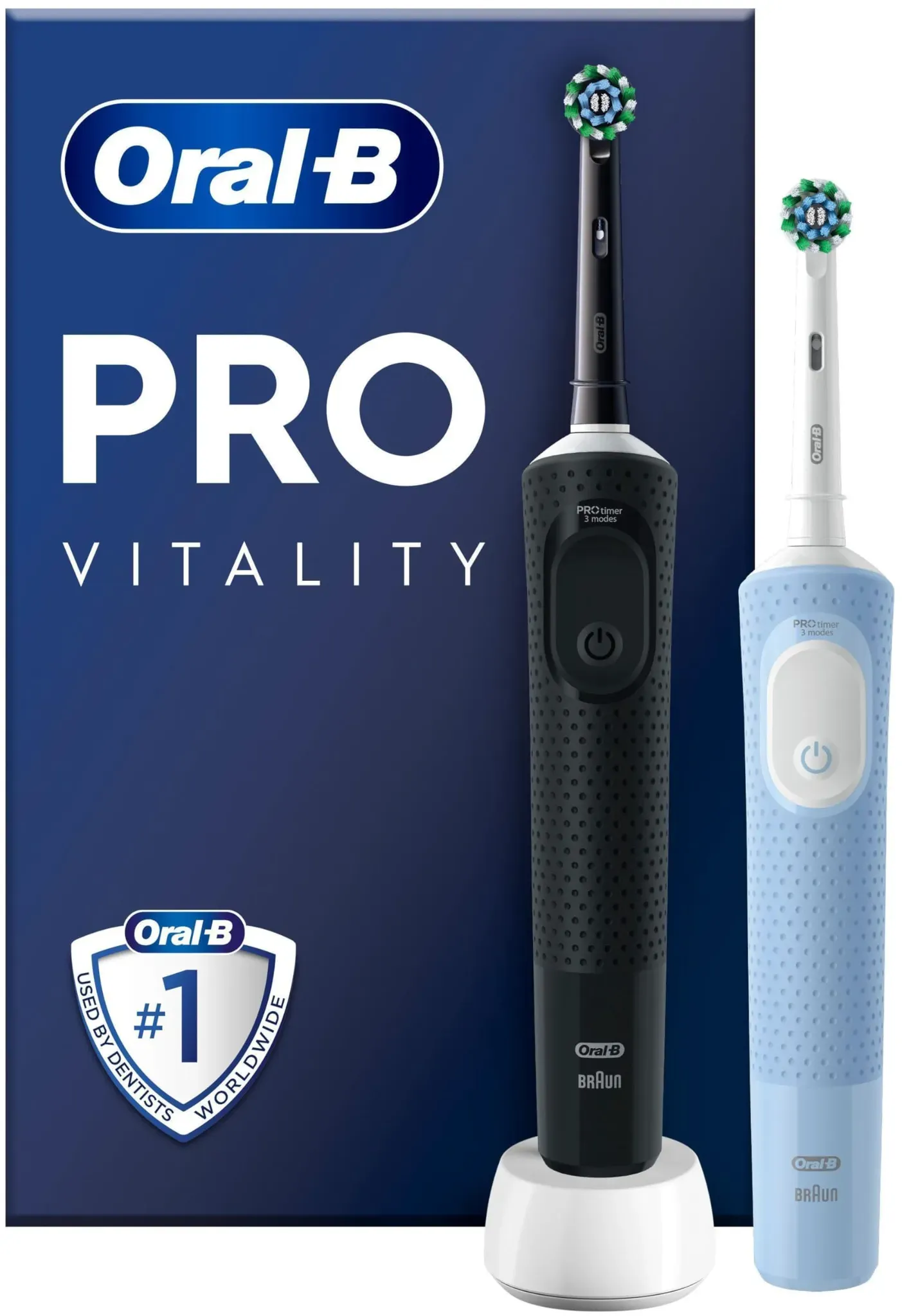 Oral-B - EAN: 4210201432227 - . Für eine gründliche und sanfte Reinigung dank 2D-Technologie . Mit 2 Zahnbürsten und 2 Aufsteckbürsten . 3 Putzprogramme: Tägliche Reinigung, Sensitiv und Sensitiv-Plus . Integrierter 2-Minuten Timer hilft alle Putzbereiche professionell zu putzen . Bis zu 8 Tage Akkulaufzeit . Entfernt bis zu 100% mehr Plaque als eine Handzahnbürste . Weiches mit Gummi überzogenes ergonomisches Handstück . Kompatibel mit allen Aufsteckbürsten von Oral-B, außer Pulsonic und iO Merkmale: Serie: Vitality geeignet für: Erwachsene Reinigungstechnik: Rotierend Programme: Empfindliche Zähne Ausführung: Doppelpack weitere Produktinformationen: Farbe: schwarz, lila Stromversorgung: NiMH-Akku Betriebszeit: bis zu 8 Tage Funktionen: Timer, 2D-Reinigungstechnologie Putzprogramme: 3 Smart-Modi (Tägliche Reinigung, Sensitiv, Sensitiv-Plus) Lieferung: inkl. 2 Zahnbüsten (schwarz und lila), 2x Aufsteckbürste (CrossAction), Ladestation - bei bueromarkt-ag.de - aus Yadore Produktdaten Dies ist das günstigste Angebot für ein Vitality Pro Duo-Set, ideal für preisbewusste Käufer. ![]() ![]() Oral-B Vitality Pro D103 Duo Black/Blue