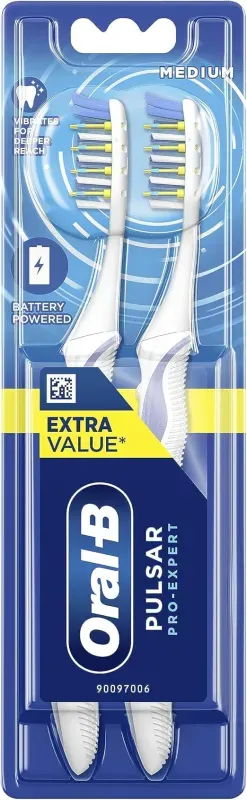 EAN: 3014260319595 - Zahnbürste ProExpert PULSAR 35, mittelGründlichere Reinigung und die Handhabung wie bei einer Handzahnbürste kombiniert die gewohnte Kontrolle einer Handzahnbürste zusammen mit einer verbesserten Reinigung der Zähne- pulsierende Borsten für eine gründliche Rinigung- AN und AUS Knopf an der Seite- schmaler, handlicher Griff mit eingebauter BatterieHinweis: Die Batterie kann nicht ausgetaucht werden. Die batteriebetriebene Zahnbürste Pulsar Pro-Expert von Oral-B ist mit vibrierenden Borsten ausgestattet und gibt Ihnen gleichzeitig die Kontrolle einer herkömmlichen Handzahnbürste. Plaque wird effektiv, auch an schwer zugänglichen Stellen, entfernt. Die vibrierenden Borsten massieren außerdem sanft Ihr Zahnfleisch. Hinweis: Nicht geeignet für Kinder bis zu einschließlich n. Enthält nicht-austauschbare Primärbatterie. Das Produkt ist nicht dazu geeignet, geöffnet zu werden, außer zu Recycling-Zwecken. Artikel wird sortiert geliefert. Eine Vorauswahl von Farbe/Muster/Modell ist bei der Bestellung nicht möglich.. Keine Vorauswahl der Farben möglich.Hersteller-Nr: EAN: 3014260319595Anzahl Zahnbürsten pro Packung: 1 Oral b Pulsar,weich,batteriebetrieben,Batterie kann nicht getauscht werden;Procter und Gamble Service GmbH Frankfurter Str.145, D-61476 Kronberg / Taunus - hochwertiges medizinisches Gerät - zur gezielten Versorgung - Zahnbürste zur gezielten Anwendung - Gesundheitsprodukt aus der Apotheke - Hersteller: Hersteller: Procter & Gamble GmbH, ... ![]() ![]() Oral-B Pulsar Handzahnbürste für Erwachsene, 35 Medium Twin Pack