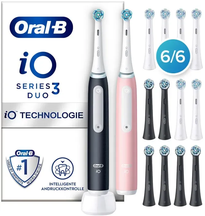 Oral-B - EAN: 8006530069229 - ERHALTEN SIE GESüNDERES ZAHNFLEISCH IN NUR 1 WOCHE - entfernen Sie 100 % mehr Plaque im Vergleich zu einer Handzahnbürste mit der FORTSCHRITTLICHSTEN TECHNOLOGIE VON ORAL-B SCHüTZEN SIE IHR ZAHNFLEISCH MIT DEM iO-DRUCKSENSOR, dem einzigen Sensor von Oral-B, der Sie benachrichtigt, wenn Sie den PERFEKTEN DRUCK für eine effektive und sichere Zahnreinigung anwenden MAXIMIEREN SIE IHR ZäHNEPUTZEN mit dem iO-LICHT-TIMER, der der Empfehlung von Zahnärzten für 2 Minuten Putzen folgt - und IHNEN SAGT, WANN DER BüRSTENKOPF AUSGETAUSCHT WERDEN MUSS Wählen Sie zwischen 3 PUTZMODI, um DAS PERFEKTE ZäHNEPUTZEN FüR SIE zu erhalten: Tägliche Reinigung, Sensitiv und Aufhellen Die RUNDEN Bürstenköpfe von Oral-B ERREICHEN STELLEN, die RECHTECKIGE Handzahnbürsten NICHT erreichen - erleben Sie eine bessere Reinigung von Oral-B, der weltweit am häufigsten von Zahnärzten verwendeten Marke Profitieren Sie von einer LANG ANHALTENDEN LADUNG mit dem Lithium-Ionen-Akku Die elektrische Zahnbürste Oral-B iO 3 ist mit der besten Technologie von Oral-B ausgestattet und kombiniert einen von Zahnärzten inspirierten runden Bürstenkopf mit mikrovibrierenden Borsten für ein professionelles, reinigendes und sauberes Gefühl zu Hause. Der intelligente Drucksensor hilft Ihnen, weder zu hart noch zu weich zu putzen, damit Sie Ihr Zahnfleisch besser schützen. Ein intelligenter Drucksensor warnt Sie, wenn Sie zu hart putzen. Ersetzen Sie Ihren Oral-B iO Series Bürstenkopf alle 3 Monate ... Dieses Angebot ist ein Duo-Paket mit zwei Handstücken in Schwarz/Pink, ideal für Paare oder Familien. ![]() ![]() Oral-B Elektrische Zahnbürste "iO3 + 2. Handstück" in Schwarz/Pink | Gr.: onesize
