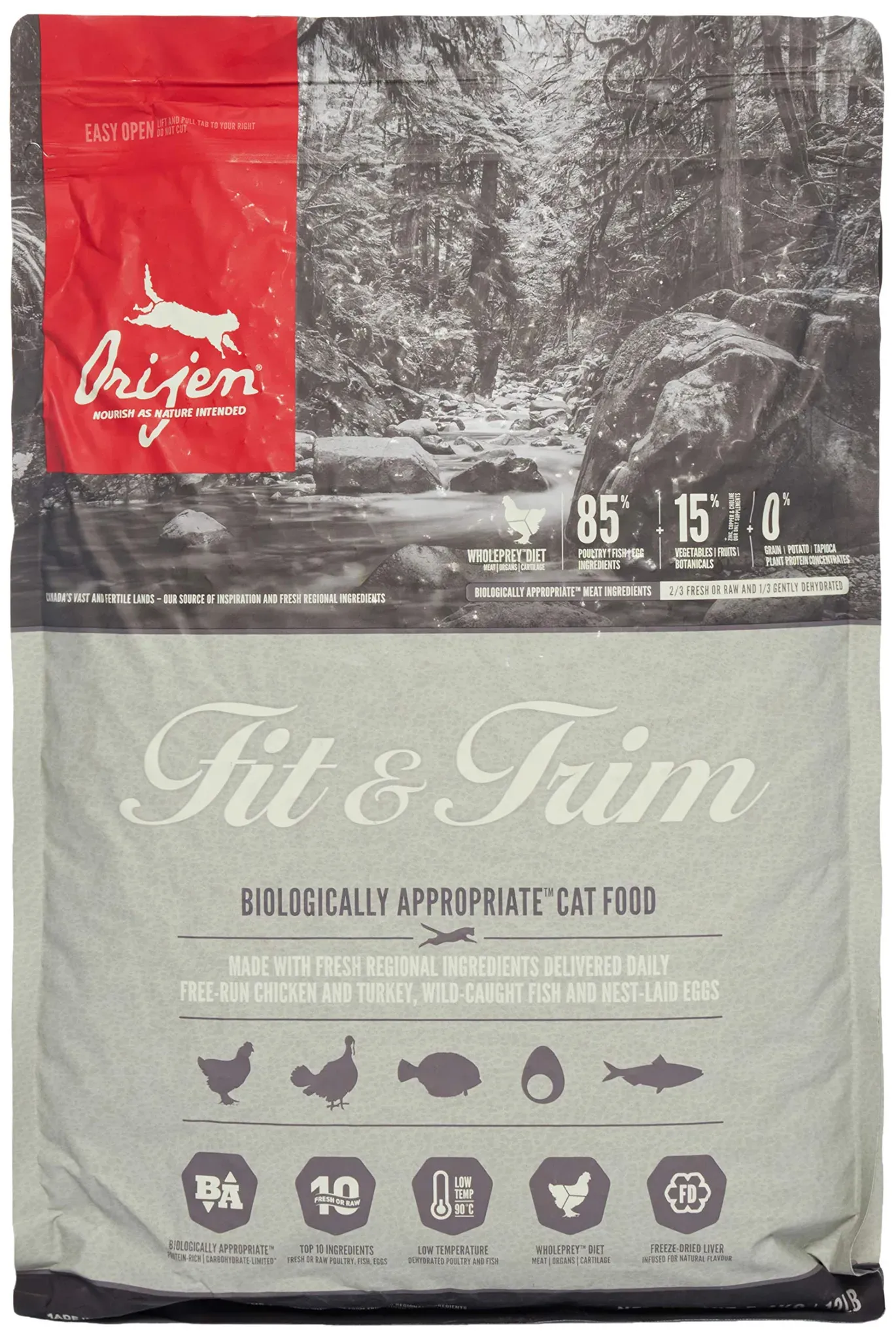 10.53 / KG - Kategorie: Katzenfutter - Orijen - GTIN:0064992718930 - Alleinfuttermittel (biologisch geeignet) mit Huhn/Truthahn/Kaninchen/Fisch-Geschmack, für ausgewachsene Katzen - 56,88 Euro bei Zooland - gefunden von billiger.de Orijen Katzenfutter Fit und Trim (getreidefrei) in der 5,4 kg Packung ist ideal für Katzen, die zu Übergewicht neigen oder ein gesundes Gewicht halten sollen. ![]() ![]() Orijen Katzenfutter Fit und Trim (getreidefrei) - 5,4 kg