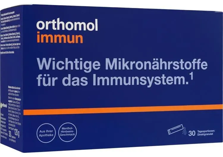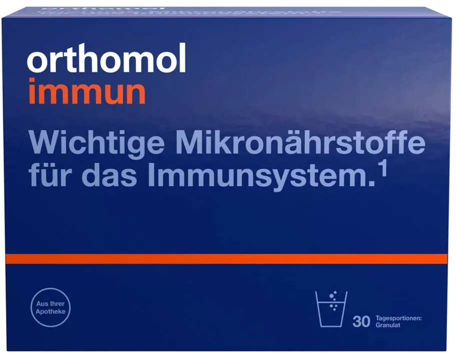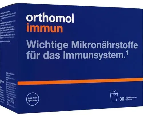 Verfügbarkeit: Lieferbar in 1-2 Werktagen - 1,62 €/St - Kategorie: Nahrungsergänzungsmittel - Orthomol - GTIN:4150013199621 - PZN:01319962 - Orthomol ImmunOrthomol Immun ist ein Nahrungsergänzungsmittel. Mit Vitamin C, Vitamin D und Zink als Beitrag zu einer normalen Funktion des Immunsystems.Anwendung:Täglich den Inhalt eines Beutels (= Tagesportion) in ca. 100 - 150 ml stillem Wasser oder Fruchtsaft einrühren und zu oder nach einer Mahlzeit einnehmen.Hinweis: Zur Abdeckung des spezifisch erhöhten Mikronährstoffbedarfs empfiehlt sich die langfristige Einnahme von Orthomol Immun.Orthomol Immun in der Darreichungsform Trinkfläschchen ist lactose- und glutenfrei.Enthält leicht verfügbare Kohlenhydrate sowie Jod. Verwenden Sie das diätetische Lebensmittel bei Störungen der Glucosetoleranz nur unter sorgfältiger Stoffwechselkontrolle. Sollten Sie an einer Schilddrüsenüberfunktion (Hyperthyreose) leiden, sprechen Sie bitte vor der Einnahme mit Ihrem Arzt. Orthomol Immun ersetzt keine sonstige ärztliche Therapie oder Medikation.Durch die Einnahme von Orthomol Immun kann eine Gelbfärbung des Urins auftreten. Dies ist eine harmlose Begleiterscheinung und durch den Gehalt an Vitamin B2 bedingt. Gelegentlich führt Vitamin C in der in Orthomol Immun enthaltenen Menge zu einem stärkeren Stuhlgang.Aufgrund seiner Eigenschaften und Merkmale ist das Produkt in der Lage, den spezifisch erhöhten Mikronährstoffbedarf im speziellen Anwendungsbereich zu decken. ... Dieses Angebot bietet das klassische Orthomol Immun Granulat zu einem sehr guten Preis-Leistungs-Verhältnis. ![]() ![]() Orthomol Immun Granulat 30 St
