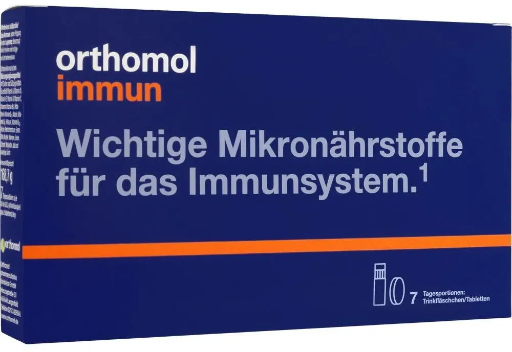 1.95 eur / 1st - Vitamine, Mineralien & Nahrungsergänzungsmittel 'Wohlbefinden Vitamine & Mineralien','Arzneimittel-Gesundheit Erkältung & Immunsystem Abwehrstärkung','Wohlbefinden Vitamine & Mineralien Multivitaminpräparate','Wohlbefinden Ernährung','Wohlbefinden Vitamine & Mineralien Calcium','Arzneimittel-Gesundheit Männergesundheit' Vitamine & Ergänzungen - EAN:4150013199560 - Orthomol ImmunOrthomol Immun ist ein Nahrungsergänzungsmittel. Mit Vitamin C, Vitamin D und Zink als Beitrag zu einer normalen Funktion des Immunsystems.Anwendung:Täglich den Inhalt eines Beutels (= Tagesportion) in ca. 100 - 150 ml stillem Wasser oder Fruchtsaft einrühren und zu oder nach einer Mahlzeit einnehmen.Hinweis: Zur Abdeckung des spezifisch erhöhten Mikronährstoffbedarfs empfiehlt sich die langfristige Einnahme von Orthomol Immun.Orthomol Immun in der Darreichungsform Trinkfläschchen ist lactose- und glutenfrei.Enthält leicht verfügbare Kohlenhydrate sowie Jod. Verwenden Sie das diätetische Lebensmittel bei Störungen der Glucosetoleranz nur unter sorgfältiger Stoffwechselkontrolle. Sollten Sie an einer Schilddrüsenüberfunktion (Hyperthyreose) leiden, sprechen Sie bitte vor der Einnahme mit Ihrem Arzt. Orthomol Immun ersetzt keine sonstige ärztliche Therapie oder Medikation.Durch die Einnahme von Orthomol Immun kann eine Gelbfärbung des Urins auftreten. Dies ist eine harmlose Begleiterscheinung und durch den Gehalt an Vitamin B2 bedingt. Gelegentlich führt Vitamin C in der in Orthomol ... Eine praktische Option für eine 30-Tages-Kur in Trinkampullen/Tabletten-Kombination. ![]() Orthomol Immun Trinkfläschchen/Tabl.Kombipack. 30 St Trinkampullen