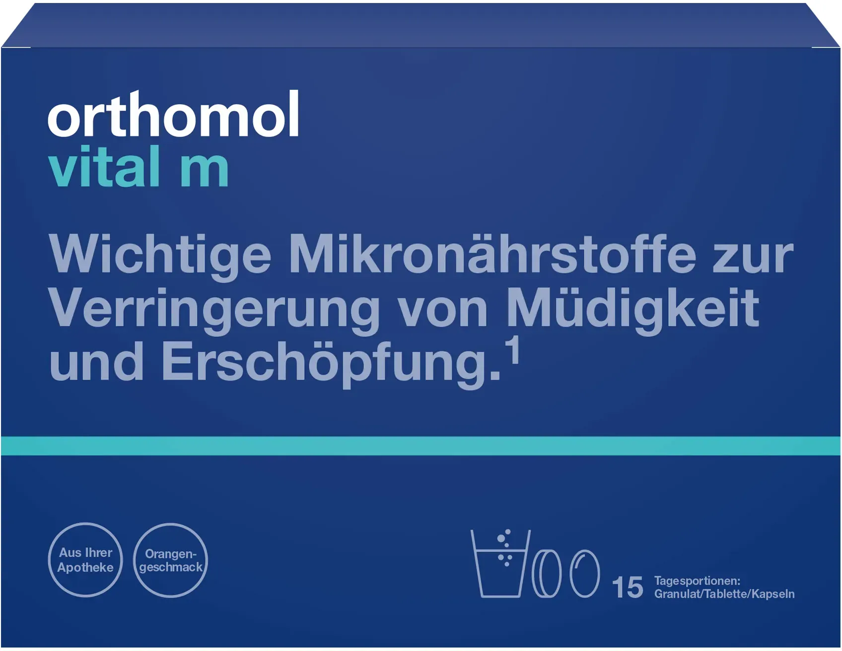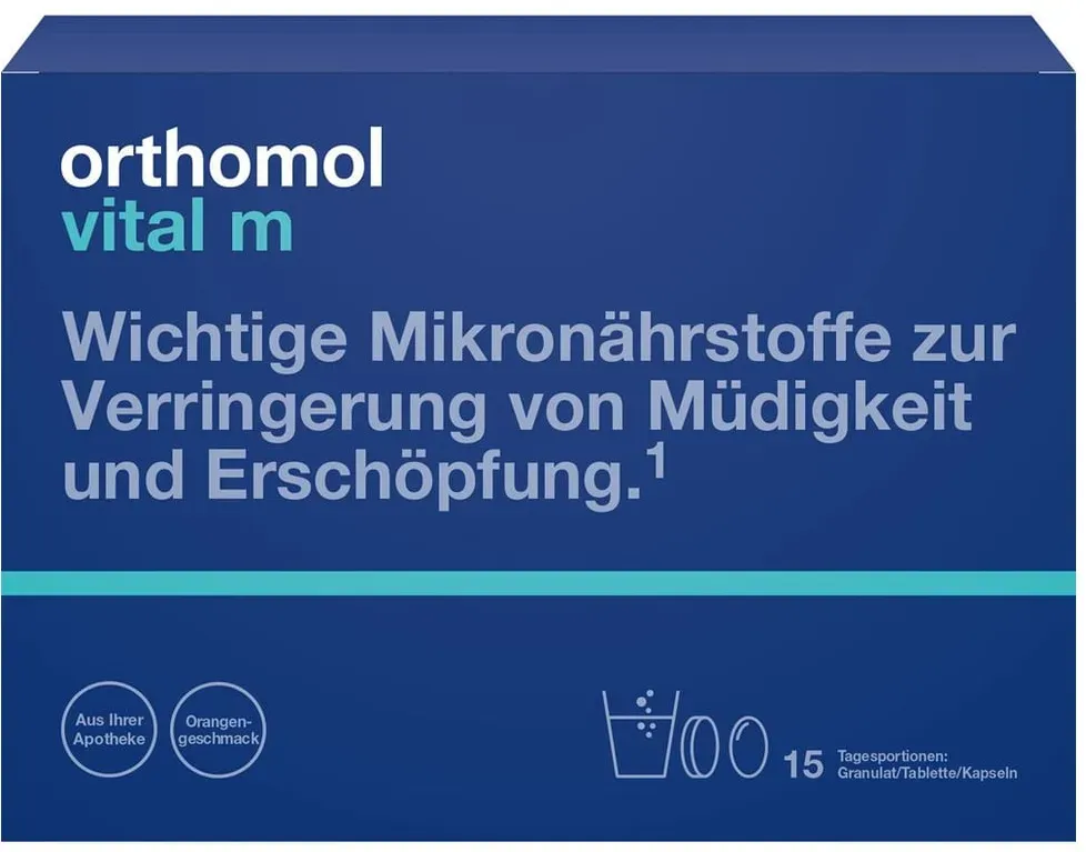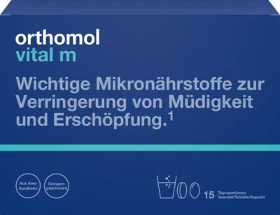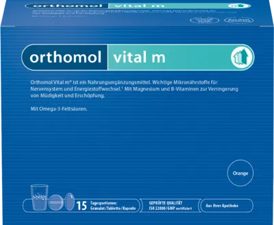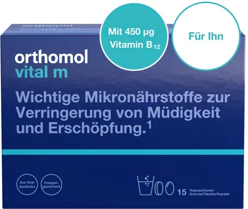 Orthomol Vital ist ein Nahrungsergänzungsmittel. Wichtige Mikronährstoffe zur Verringerung von Müdigkeit und Erschöpfung. Vitamin B12 und Magnesium tragen zur Verringerung von Müdigkeit und Erschöpfung sowie zu einem normalen Energiestoffwechsel bei. Enthält Omega-3-Fettsäuren und Calcium (Calcium nur in Orthomol Vital f enthalten). ? Spezifische Mikronährstoffkombination für ?Sie? und ?Ihn? ? Mit dem gesamten Vitamin-B-Komplex inkl. 450 g Vitamin B12 je Tagesportion ? 3 Darreichungsformen ? 2 Geschmacksrichtungen beim Granulat: Orange und Grapefruit ? Separate Jodtablette bei Granulat und Tabletten/Kapseln ? Lactose- und glutenfrei ? Vitamin C, Riboflavin (Vitamin B2), Vitamin B6, Vitamin B12, Folsäure, Niacin, Pantothensäure und Magnesium tragen zur Verringerung von Müdigkeit und Erschöpfung bei. ? Thiamin (Vitamin B1), Riboflavin (Vitamin B2), Vitamin B6, Vitamin B12, Pantothensäure, Niacin, Vitamin C, Biotin, Magnesium, Calcium, Jod, Mangan und Kupfer tragen zu einem normalen Energiestoffwechsel bei (Calcium nur in Orthomol Vital f enthalten). ? Thiamin (Vitamin B1), Riboflavin (Vitamin B2), Vitamin B6, Vitamin B12, Vitamin C, Niacin, Biotin, Magnesium, Kupfer und Jod tragen zu einer normalen Funktion des Nervensystems bei. ? Vitamin C, Vitamin E, Riboflavin (Vitamin B2), Zink, Selen, Kupfer und Mangan tragen dazu bei, die Zellen vor oxidativem Stress zu schützen. ? Die Omega-3-Fettsäuren EPA und DHA tragen zu einer normalen Herzfunktion bei. Die positive Wirkung ... ![]() ![]() Orthomol Vital M 15Granulat/Kapseln