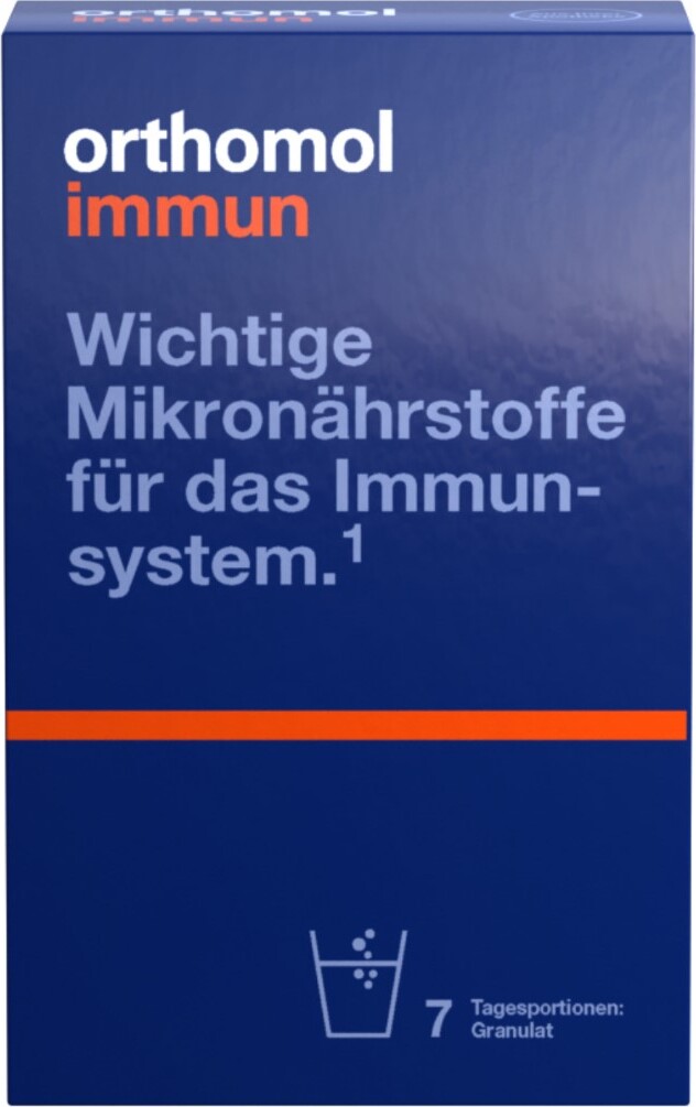 2,05 €/St - Kategorie: Nahrungsergänzungsmittel - Orthomol - GTIN:4150188247301 - PZN:18824730 - Orthomol ImmunOrthomol Immun ist ein Nahrungsergänzungsmittel. Mit Vitamin C, Vitamin D und Zink als Beitrag zu einer normalen Funktion des Immunsystems.Anwendung:Täglich den Inhalt eines Beutels (= Tagesportion) in ca. 100 - 150 ml stillem Wasser oder Fruchtsaft einrühren und zu oder nach einer Mahlzeit einnehmen.Hinweis: Zur Abdeckung des spezifisch erhöhten Mikronährstoffbedarfs empfiehlt sich die langfristige Einnahme von Orthomol Immun.Orthomol Immun in der Darreichungsform Trinkfläschchen ist lactose- und glutenfrei.Enthält leicht verfügbare Kohlenhydrate sowie Jod. Verwenden Sie das diätetische Lebensmittel bei Störungen der Glucosetoleranz nur unter sorgfältiger Stoffwechselkontrolle. Sollten Sie an einer Schilddrüsenüberfunktion (Hyperthyreose) leiden, sprechen Sie bitte vor der Einnahme mit Ihrem Arzt. Orthomol Immun ersetzt keine sonstige ärztliche Therapie oder Medikation.Durch die Einnahme von Orthomol Immun kann eine Gelbfärbung des Urins auftreten. Dies ist eine harmlose Begleiterscheinung und durch den Gehalt an Vitamin B2 bedingt. Gelegentlich führt Vitamin C in der in Orthomol Immun enthaltenen Menge zu einem stärkeren Stuhlgang.Aufgrund seiner Eigenschaften und Merkmale ist das Produkt in der Lage, den spezifisch erhöhten Mikronährstoffbedarf im speziellen Anwendungsbereich zu decken. Bedarfsanpassungshinweis gemäß § 14b Abs. 5 DiätV: Zur Vermeidung einer ... Dieses Angebot für Orthomol Immun Granulat Beutel ist eine sehr günstige Option für eine einzelne Anwendung oder zum Ausprobieren. ![]() ![]() Orthomol Immun Granulat Beutel