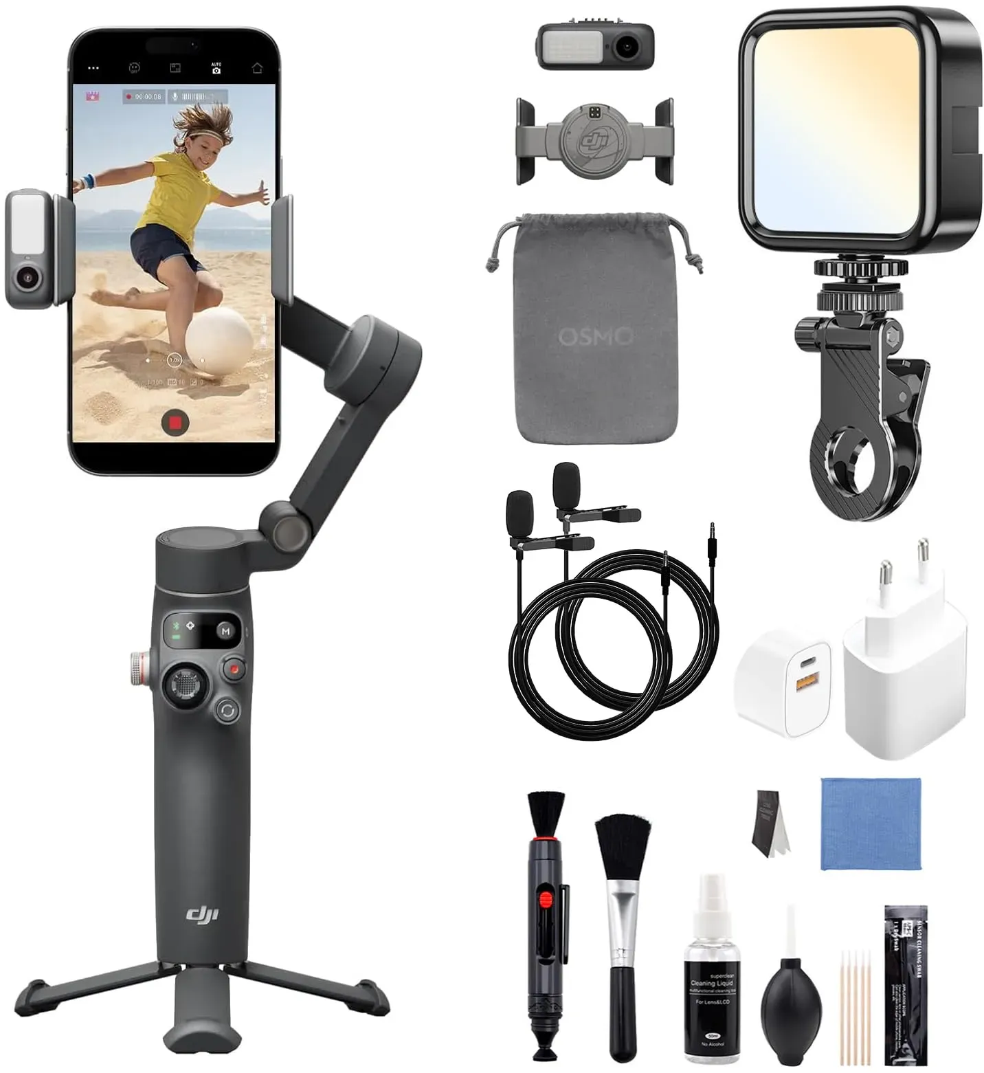 Kategorie: Handy-Gadgets - DJI - GTIN:0190021633254 - Extra vielseitiges Zubehör - Um Ihnen die Nutzung zu erleichtern und der Marktnachfrage gerecht zu werden. All diese Teile können perfekt an die Osmo Mobile 7P angepasst werden. Fange das Spektakuläre ein - Das Multifunktions-Modul vereint intelligentes Tracking, DJI Mic Mini Empfänger und Beleuchtungsfunktionen in einer kompakten Einheit. Kombiniere es mit deinem Handy-Gimbal für ideale Aufnahmen jedes Mal. Erlebe nahtlose Stabilität - Die robuste Stabilisierung des auf drei Achsen stabilisierten Gimbals des Osmo Mobile 7P sorgt für verlustfreie Stabilität. Fange kreative Ausbrüche ein und erschaffe mühelos atemberaubende Meisterwerke in Kinoqualität. Wie ein Profi von Anfang an aufnehmen - Kombiniere dein Osmo Mobile 7P mit DJI Mimo für ShotGuides und One-Tap Bearbeitung. Filme und bearbeite wie ein Profi, spare Zeit und verbessere sofort dein kreatives Storytelling. So schnell, so einfach - Klappe den Gimbal auf, um ihn einzuschalten. Montiere ein gekoppeltes Smartphone einfach mit dem magnetischen Design, und die Mimo-App öffnet sich automatisch [3], sodass du sofort filmen kannst. Vereinfache deine Kreativität - Der integrierte Verlängerungsstab und das Stativ [4] des Osmo Mobile 7P ermöglichen es dir, mühelos weite Selfies und stabile Vlogs aufzunehmen und bieten kreative Freiheit ohne den Aufwand zusätzlicher Ausrüstung. Stärke deine stabile Kreativität - Der Osmo Mobile 7P bietet eine maximale Betriebszeit von ... Dieses Bundle enthält den Gimbal-Stabilisator mit Ladestecker, Fülllicht, Reinigungsset und Tragetasche, was es zu einem Komplettpaket macht. ![]() ![]() DJI Osmo Mobile 7P Bundle Gimbal-Stabilisator für iPhone, Android, Natives Tracking, Beleuchtung, 3-Achsen-Smartphone-Gimbal, schneller Start (Ladestecker+Fülllicht+Reinigungsset+Tragetasche)