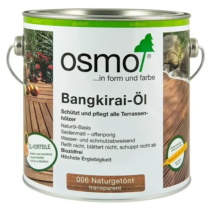 10 Händlerangebote bei billiger.de - Kategorie: Farben & Lacke - OSMO - Osmo Anti-Rutsch Terrassen-öl - Rutschgehemmter, ölbasierter Anstrich €“ mehr Sicherheit für Ihre Familie! Osmo Anti-Rutsch Terrassen-öl ist besonders geeignet für alle Holzterrassen und Treppen im Außenbereich , z. B. Bangkirai, Massaranduba, .. - GTIN:4006850527588 Das Bangkirai-Öl naturgetönt ist eine ausgezeichnete Wahl, um die natürliche Schönheit von Bangkirai-Holz im Außenbereich zu betonen und zu schützen. ![]() ![]() Osmo Bangkirai-öl 006 (Naturgetönt, Transparent, 2,5 l, Seidenmatt)
