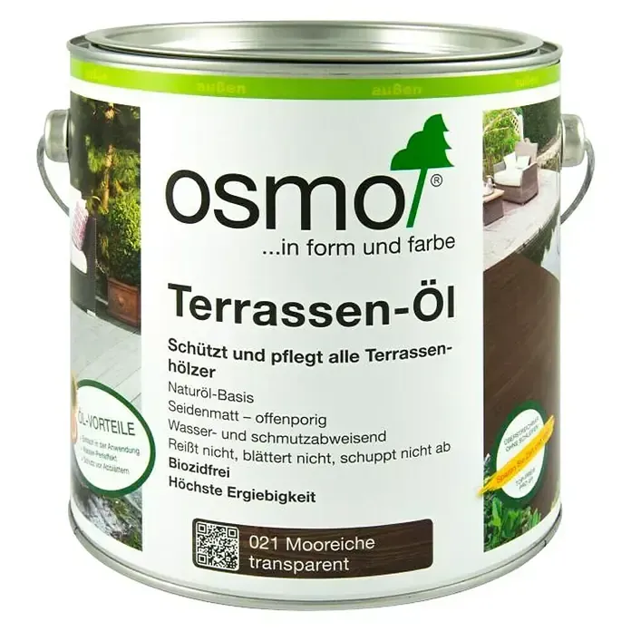 Verfügbarkeit: 2-4 Werktage - 26,78 €/l - Kategorie: Farben & Lacke - OSMO - GTIN:4006850112531 - Das Osmo Bangkirai-öl ist ein Terrassen-öl welches für die individuellen Anforderungen im Außenbereich entwickelt wurde. Dieser transparente und seidenmatte Holzanstrich ist grundsätzlich für alle Terrassenhölzer im Außenbereich bestens geeignet. Er ist offenporig, sodass das Holz atmen kann und zugleich wasserabweisend, wetterbeständig und UV-beständig. Das Terrassen-öl Bangkirai-öl bietet Schutz und Pflege. Er mindert Splitterbildung und reduziert das Quell- und Schwindverhalten. Dieses naturgetönte Pflegeöl kann ohne Grundierung angewendet werden . In seiner Verarbeitung ist das Terrassenöl einfach, denn es ist leicht und ansatzfrei verstreichbar, da es während des Streichens nicht antrocknet. Bei unbehandeltem Holz sind zwei Anstriche nötig, im Renovierungsfall reicht in der Regel ein Anstrich auf der gesäuberten Oberfläche aus. Es ist kein extra Schleifen erforderlich. Osmo Bangkirai-öl ist lt. DIN 53160 speichel- und schweißecht und kann lt. EN 71-3 auch für Kinderspielzeug eingesetzt werden. - 66,95 Euro bei BAUHAUS - gefunden von billiger.de Das Terrassen-Öl in Mooreiche ist perfekt, um Holzterrassen einen edlen, dunklen Farbton zu verleihen und gleichzeitig vor Witterung zu schützen. ![]() ![]() Osmo Terrassen-öl (Mooreiche, 2,5 l, Seidenmatt)