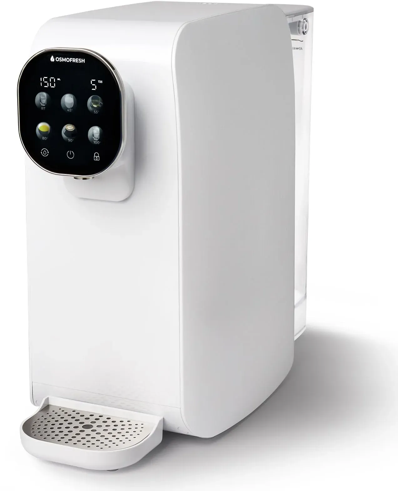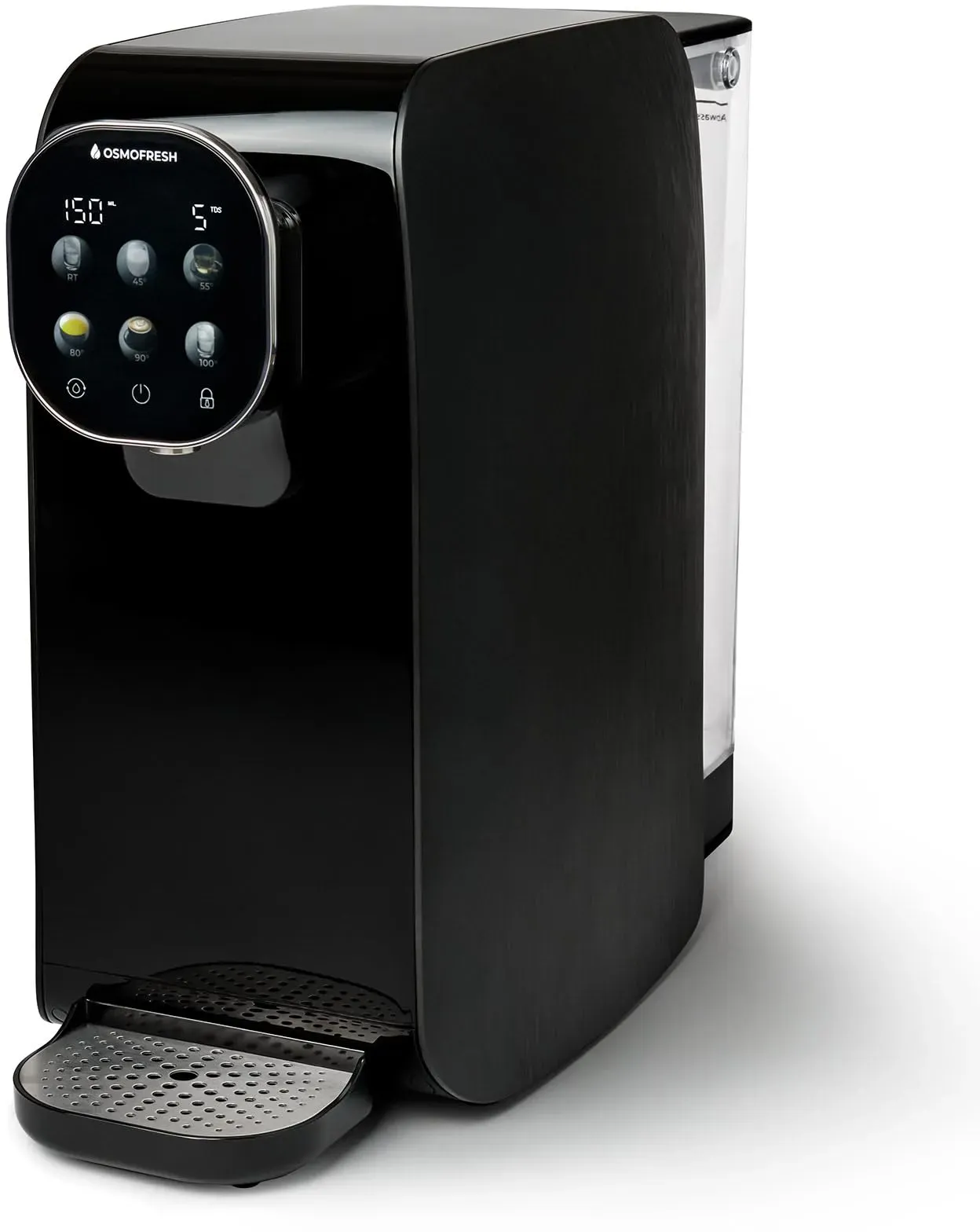 Zustand: Neu - Heißwasserspender - OsmoFresh - ROQP.W - EAN: 4255665400146 - DIE NEUE QUELLA PRO UMKEHROSMOSEANLAGE mit 28% höherem Wasserauslass, 50% hellerem Display und einstellbarer Osmosewasser Auslassmenge. Edelstahl Wasserauslass und verbesserter Abtropfschale. Dazu ScaleShield Technologie gegen Verkalkung. Einfach PRO. 4-fach FILTERUNG. 3-fach MINERALIEN. Der Osmose Wasserfilter mit 7-FACHER FILTERUNG für Trinkwasser mit dem besten Geschmack bei höchster Filterleistung Z.b. Bakterien, Viren, Medikamentenrückstände, Kalk, Fluor, Pestizide, Nitrat, Nitrit, Blei, PFAS BIS 100°C. JEDERZEIT. 6 TEMPERATURSTUFEN. Der integrierte Durchlauferhitzer ermöglicht kochend heißes Wasser in nur 3 Sek. Damit ist ihr Wasserkocher Geschichte. Egal ob 45°C, 55°C, 80°C, 90°C oder kochend. AUFGESTELLT. LOSGELEGT. ÜBERALL. Einfache Installation. Durch den wiederbefüllbaren Tank benötigt die Auftisch Osmoseanlage mit integriertem Heißwasserspender keinerlei Wasseranschlüsse. Egal ob in der Küche, im Wohnmobil auf Reisen oder im Büro. TOUCH DISPLAY & QUICK CHANGE FILTERSYSTEM. Einfachste Bedienung des Osmose Wasserspenders im täglichen Gebrauch sowie beim Filterwechsel. - Verkäufer: Osmofresh im amazon.de Marketplace ![]() ![]() OsmoFresh Auftisch Osmoseanlage Quella Pro Black | mit Heißwasserspender | 6 Temperaturstufen | 7-Fach Umkehrosmose Filterung | Wasserfilter für Küche Büro Wohnmobil | kalkfreies Trinkwasser | UV