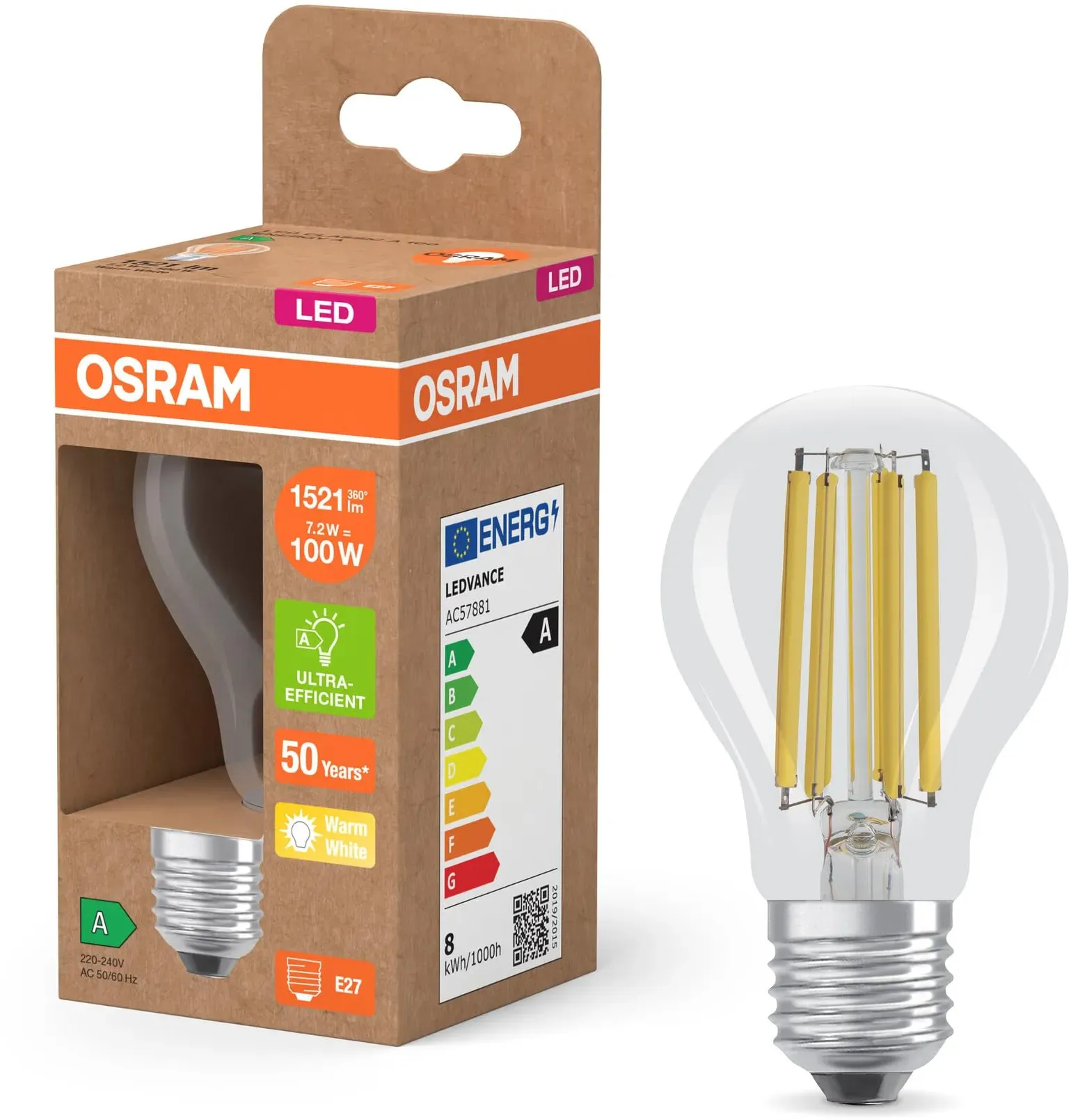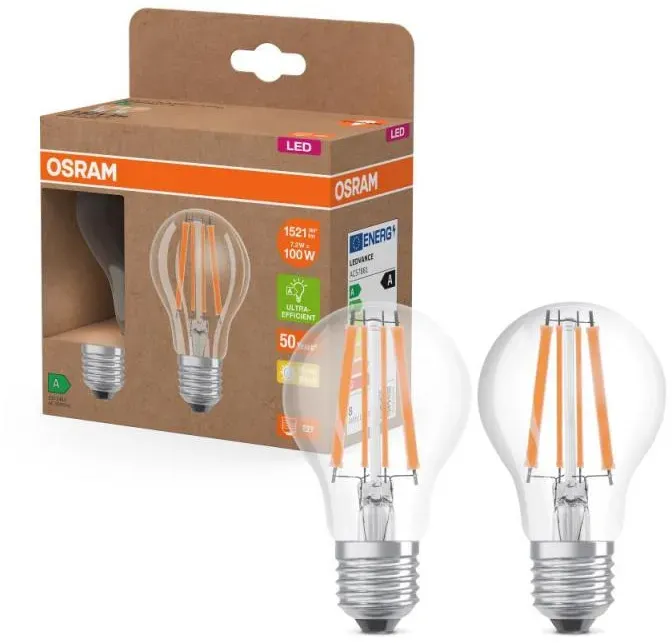 Sofort lieferbar | in 1-3 Werktagen2er Set OSRAM E27 LED Lampe Classic Filament 7,2W wie 100W warmweißes Licht 2700K - Energy efficiency class A