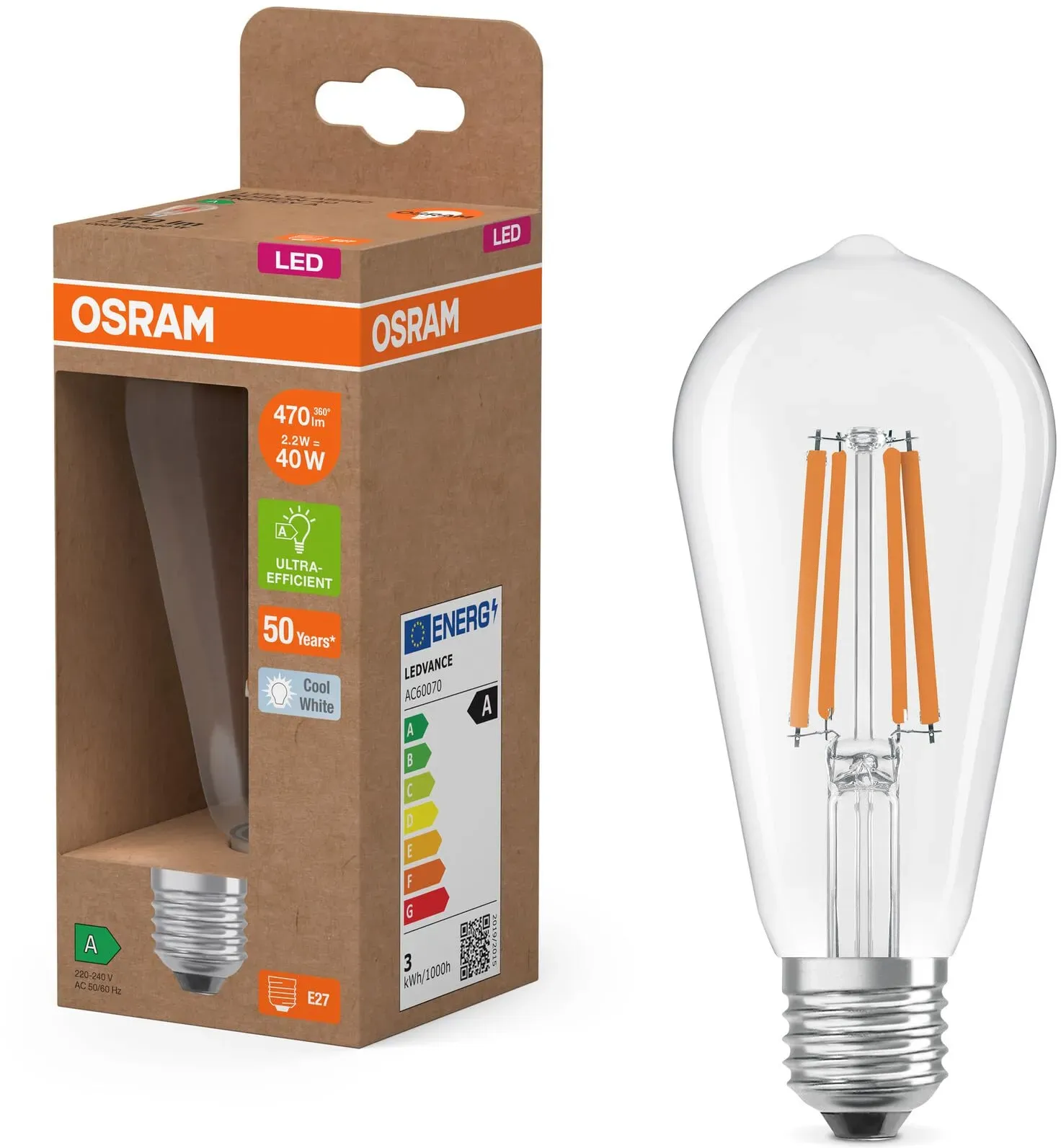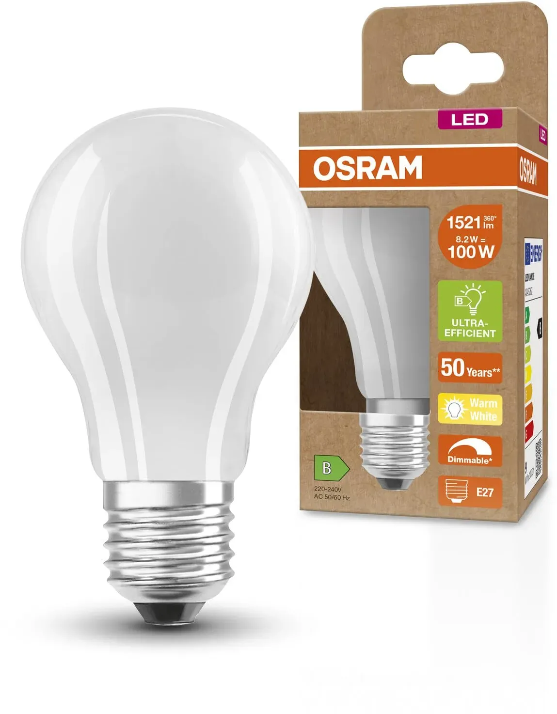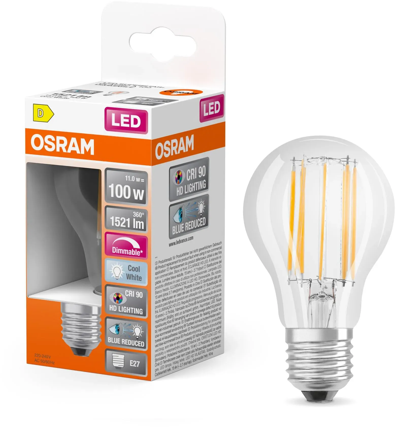 LED-Lampen Licht Leuchtmittel LED-Lampen LED Lampen Sockel E27 Glühbirnen - EAN:4058075602670 - Dimmbare LED - Lampen, klassische Kolbenform. Produkteigenschaften: LED-Lampen für Netzspannung, Ausstrahlungswinkel: bis zu 300°, Dimmbar, Farbwiedergabeindex Ra: ? 90, Produktvorteile: Lampen mit innovativer LED-'Filament'-Technologie, Design, Abmessungen, Lichtstrom vergleichbar mit einer Halogenlampe, Natürliches Lichtspektrum mit hervorragender Farbwiedergabe von CRI 90, Stark reduzierter Blauanteil, Verbesserter Sehkomfort und geringere Augenbelastung, Sehr geringer Energieverbrauch, Sofort 100 % Licht, keine Aufwärmzeit, Geringes flackern, Anwendungsgebiete: Ideal für dekorative Einbauten, Anwendungen im Haushalt, Allgemeinbeleuchtung, Einsatz im Außenbereich nur in geeigneten Außenleuchten, Technische Daten: Länge: 105 mm, Breite: 60 mm, Höhe: 60 mm, Durchmesser: 60 mm, Nettogewicht: 31 g, Sockel: E27, Nennspannung: 240 V, Nennstrom: 52 mA, Bemessungsleistung: 11 W, Energieverbrauch: 11 kWh/1000, Farbtemperatur: 4000 K, Lichtfarbe: Kalt weiß, Lichtstrom: 1521 lm, Lichtausbeute: 138,27 lm/W, Farbwiedergabe: 90 CRI, Lebensdauer: 15000 h, Schaltzyklen: 100000, Energieeffizienzklasse: D, Dimmbar: Ja, Farbe: weiß, EAN: 4058075602670 - gefunden von Kelkoo Dieses dimmbare Filament-Leuchtmittel für 6.98 Euro bietet eine sehr gute Energieeffizienz und ist ideal für stimmungsvolle Beleuchtung. ![]() ![]() OSRAM SUPERSTAR+ CLASSIC A FIL 100 LED-Lampe, E27, Kolbenform, 8,2W, 1521lm, 2700K, warmweißes Licht, dimmbar, LED-Filament-Technologie, sehr geringer Energieverbrauch, Energieeffizienzklasse B
