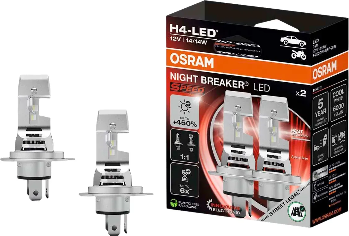 Zusammenfassung der wichtigsten Merkmale: | Merkmal | Osram NIGHT BREAKER LED SPEED H4 | |--------------------------|---------------------------------------------------| | Helligkeit | Bis zu 450 % mehr als Halogen | | Farbtemperatur | Ca. 6000 K (kaltweiß) | | Energieverbrauch | Bis zu 60 % weniger als Halogen | | Lebensdauer | Bis zu 6-mal länger als Halogen | | Straßenzulassung | Ja, TÜV und KBA geprüft | | Einfache Installation | Plug-and-Play | | Preisbereich | Ca. 60-120 Euro pro Paar | Wenn Sie auf der Suche nach einer modernen, leistungsstarken und legalen LED-Nachrüstlösung für H4-Scheinwerfer sind, ist die Osram NIGHT BREAKER LED SPEED H4 eine sehr gute Wahl. Achten Sie beim Kauf darauf, dass die Lampe für Ihr Fahrzeugmodell zugelassen ist (Kompatibilitätslisten beachten)[9]. Für die Suche im Meta-Preisvergleich können Sie direkt nach Osram Night Breaker LED Speed H4 suchen, um aktuelle Angebote und Preise zu vergleichen. Jetzt live Suche nach osram led h4 speed starten! Osram led h4 speed Angebote aus dem beliebtesten Preisbereich*Durch Käufe über Links zu Händlern kann diese Website eine Provision erhalten, u.a. durch das eBay Partner Network und das AmazonPartnerNet![]() ![]() OSRAM H7 - NIGHT BREAKER eBay LED SPEED StVZO-Konforme Motorrad LED-Nachrüstlampe Neu