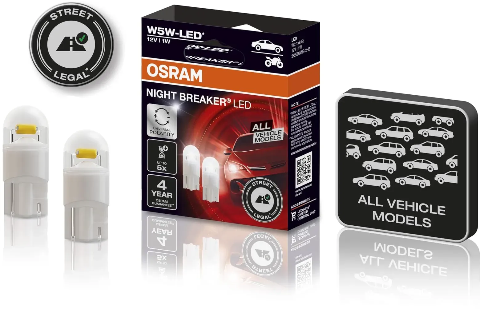Osram Automotive - EAN: 4062172367424 - Mit der NIGHT BREAKER W5W-LED ist jetzt die erste straßenzugelassene1) W5W-LED-Ersatzlampe von OSRAM auf dem Markt, die für den Einsatz in allen1) 12V-Fahrzeugmodellen, hinter weißem Glas als Stand-, Positions-, Begrenzungs-, Kennzeichen- und Innenraumleuchte zugelassen ist. Dies ist die erste NIGHT BREAKER LED-Lampe von OSRAM, bei der man die Scheinwerfer-Zulassungsnummer nicht mit einer Kompatibilitätsliste überprüfen und abgleichen muss. In Kombination mit der NIGHT BREAKER H7-LED, H4-LED oder H1-LED können Sie nun ein umfassendes LED-Upgrade mit perfekt aufeinander abgestimmten und designten LED-Lampen für den Außen- und Innenbereich Ihres Fahrzeuges erhalten. Die NIGHT BREAKER W5W-LED Nachrüstlampen sind als Ersatz für herkömmliche W5W-Lampen und -Sockel geeignet. Sie bieten ein modernes und helles weißes Licht mit einer Farbtemperatur von bis zu 5700 Kelvin und einer Leuchtkraft von bis zu 50 lm. Im Vergleich zu konventionellen Leuchtmitteln, verbrauchen diese LED-Retrofit-Lampen bis zu 80% weniger Energie. Durch die Plug & Play Lösung und die universelle Polarität können sie schnell und einfach und unabhängig von der Polung installiert werden. Ersetzen Sie jetzt Ihre Fahrzeuglampen durch die revolutionären LED-Nachrüstlampen von OSRAM und erleben Sie zukunftsweisende Helligkeit. 1) Zugelassenes LED-Fahrzeuglicht. Gilt für alle Fahrzeugmodelle für bestimmte Lichtfunktionen und weitere Einschränkungen im jeweiligen Land. - bei ... Ein gutes Angebot für ein 2er-Set der Night Breaker 2.0 mit StVZO-Zulassung und 6000K. ![]() ![]() 2x W5W - OSRAM LED eBay Night Breaker 2.0 mit StVZO Straßenzulassung 2825DWNBC 6000K 1W