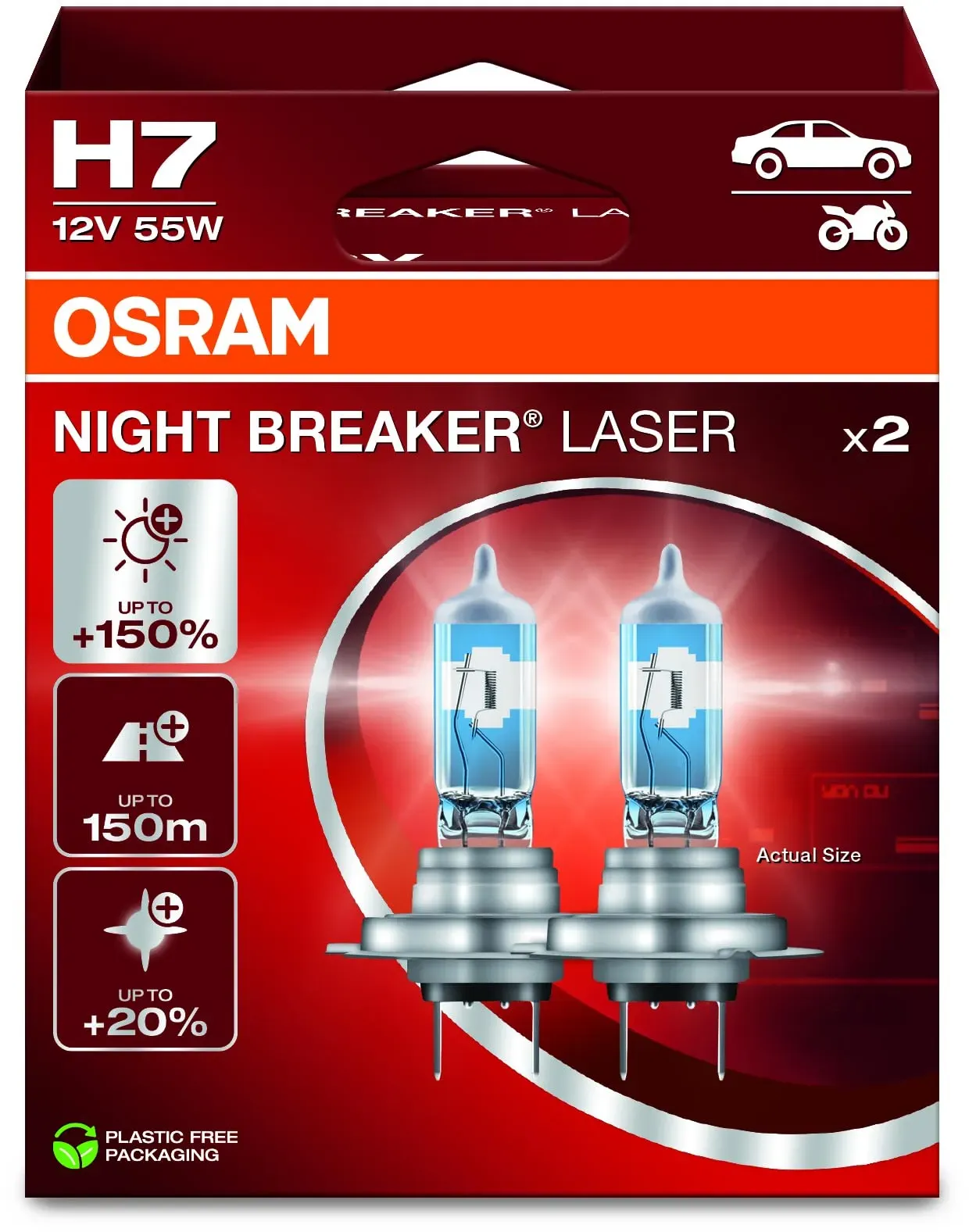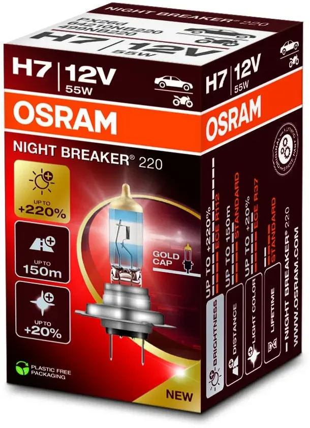 Auto & Navigation Autobeleuchtung Kfz-Leuchtmittel, LKW-Leuchtmittel Autoteile, Zubehör und Styling - EAN:4062172395168 - Starkes Halogenlicht für hohe AnsprücheDank innovativer Laserablationstechnologie leuchten NIGHT BREAKER LASER Scheinwerferlampen im Vergleich zu den gesetzlichen Mindestanforderungen um bis zu 150% heller. Das hochentwickelte Filament sorgt für einen zusätzlichen Lichtschub. Damit erzielen die Lampen einen bis zu 150m langen Lichtkegel und ein bis zu 20% weißeres Licht im Vergleich zu den gesetzlichen Mindestanforderungen. Mehr Licht und bessere Sicht können Fahrer dabei unterstützen, Verkehrsgefahren schneller zu erkennen und darauf zu reagieren. Darüber hinaus besticht die OSRAM NIGHT BREAKER LASER durch einzigartiges Design (lasergravierter Produktname) und ein komplettes Portfolio (H1, H3, H4, H7, H8, H11, HB3, HB4). - gefunden von Kelkoo Dieses Angebot ist mit 11,21 Euro eine der günstigsten Optionen für eine einzelne H7 Night Breaker 220 Halogenlampe. ![]() ![]() Osram NIGHT BREAKER 220, H7, +220% mehr Helligkeit, Halogen-Scheinwerferlampe, 64210NB220, Faltschachtel (1 Lampe)