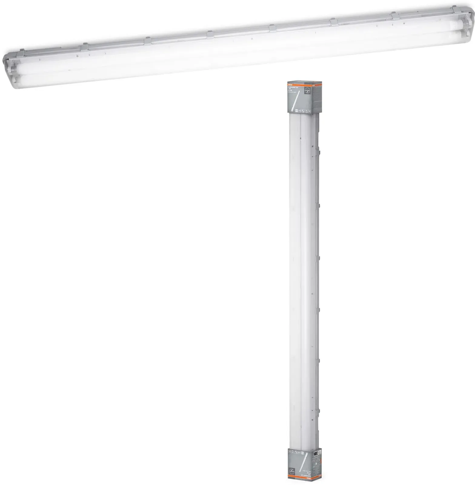 8 Händlerangebote bei billiger.de - Kategorie: Deckenleuchten - Osram - Feuchtraumleuchte mit bruchfester SubstiTUBE Star PC LED-Röhre für den Netzbetrieb €“ ideal für Keller, Garagen und Lager. Staub- und strahlwassergeschützt (IP65), quecksilberfrei und RoHS-konform. Bis zu 65 % Energieersparnis im Vergleich zu Leuchtstofflampen mit KVG. Einfache Montage und wartungsfreundlich. Nur für Innenräume, Anschluss durch Fachpersonal (Schutzklasse I). Features: Bruchfeste LED-Röhre für sichere Beleuchtung Staub- und wassergeschützt nach IP65 Quecksilberfrei und umweltfreundlich Energiesparend mit 65% weniger Verbrauch Einfache Montage durch Fachpersonal Technische Daten: Länge: 156,1 cm Leistung: 38 Watt Lichtstrom: 3800 Lumen Farbtemperatur: 4000 K (neutralweiß) Farbwiedergabe (CRI): ‰¥ 80 Lebensdauer: 30.000 Stunden Betriebsspannung: 240 V Schutzart: IP65 (staub- und strahlwassergeschützt) Schutzklasse: I Leuchtmittel: SubstiTUBE Star PC LED-Röhre enthalten Dimmbar: Nein Einsatzbereich: Innenräume (z. B. Keller, Garagen, Lagerhallen) Besonderheiten: Quecksilberfrei, RoHS-konform, einfache Montage Lieferumfang: 1x LED-Feuchtraumleuchte 1x Montagematerial - GTIN:4099854429170 ![]() ![]() Osram Submarine LED-Feuchtraumleuchte, 2x19W, neutralweiß 4000K, 3800lm, IP65, staub- und spritzwassergeschützt, für Keller und Garagen