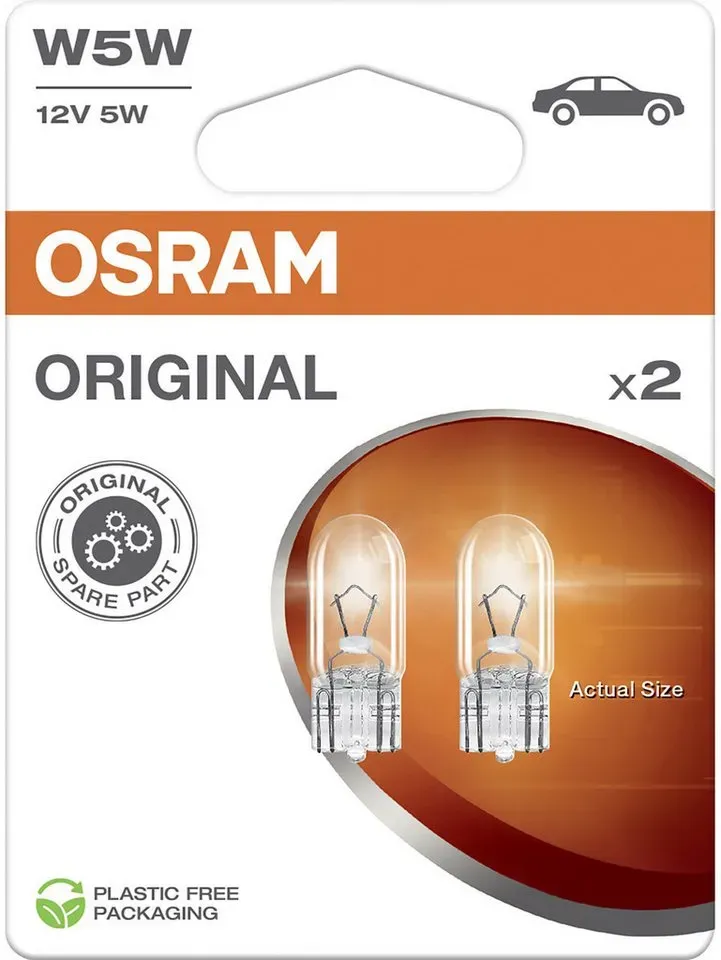 Kategorie: Autoteile - Osram - GTIN:4050300838632 - Osram W5W Original Glühlampe (2825) - Technische Informationen: Lampenart: W5W | Spannung [V]: 12 | Nennleistung [W]: 5 | Sockelausführung: W2,1x9,5d]. Einschränkungen: Die ORIGINAL Signallampen mit Glasquetschsockel sind als Originalersatzteile für verschiedene Lampentypen verfügbar. Lernen Sie diese zuverlässigen Lampen in bewährt hoher OSRAM Qualität kennen. Lampen aus der OSRAM ORIGINAL LINE 12-V-Familie sind zuverlässig und beweisen zudem preisliche Bodenhaftung. Kunden, die bewährte Qualität zu schätzen wissen, treffen mit der ORIGINAL LINE 12V die richtige Wahl. - 0,29 Euro bei atp-autoteile.de - gefunden von billiger.de Ein günstiges Doppelpack der Osram Original W5W Signallampe, perfekt für den schnellen Austausch beider Seiten. ![]() ![]()