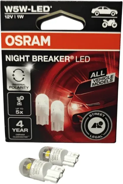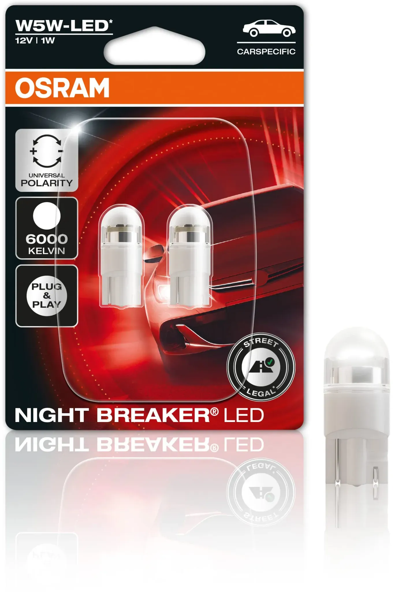 Kategorie: Autolampen - Osram - GTIN:4062172367424 - LED W5W Osram NIGHT BREAKER GEN2 6000K mit Zulassung 12V 1W W2.1x9.5d StVZO zugelassene LED-Nachrüstung hinter weißem Glas. Die straßenzugelassene Ersatzlampe OSRAM NIGHT BREAKER W5W-LED kann in allen 12V-Fahrzeugmodellen hinter weißem Glas als Stand-, Position... - 15,58 Euro bei ELW-Fahrzeugteile - gefunden von billiger.de Diese Osram LED-Fahrzeuglampe Night Breaker W5W 2.0 in Kaltweiß bietet eine hohe Lichtausbeute und moderne Optik. ![]() ![]() Osram LED-Fahrzeuglampe Night Breaker W5W 2.0 Kaltweiß 2 Stück