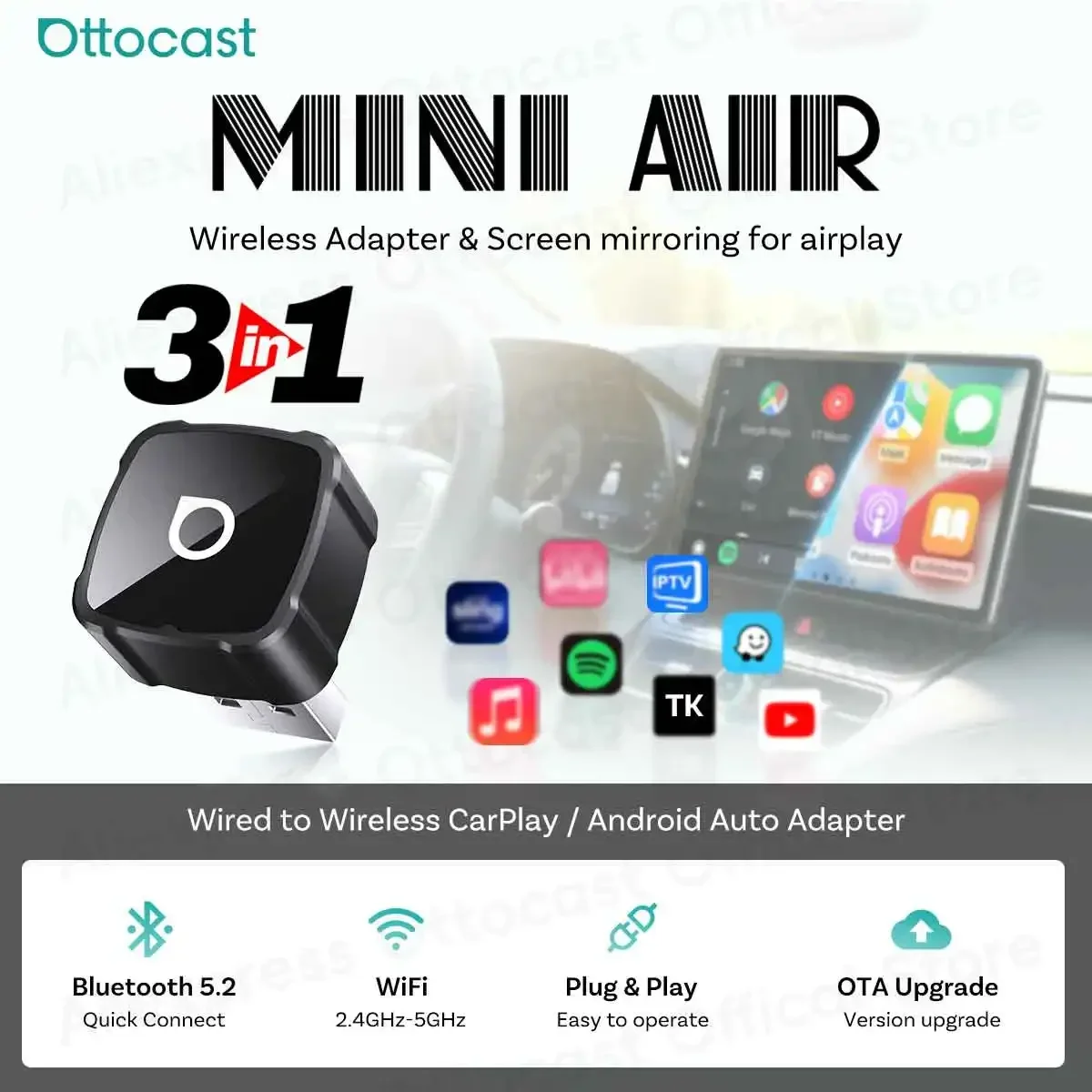OTTOCAST - OTTOCAST 3-in-1 MINI AIR Adapter 4.0 Cube Dongle 2026 Kabelloses CarPlay Android Auto für iOS Bildschirmspiegelung Auto-Zubehör - bei de.aliexpress.com - aus Yadore Produktdaten ![]() OTTOCAST Express MINI AIR 3-in-1 Cube Adapter 4.0 Kabelloses CarPlay Android Auto für iOS Bildschirmspiegelung Auto-Zubehör 2026