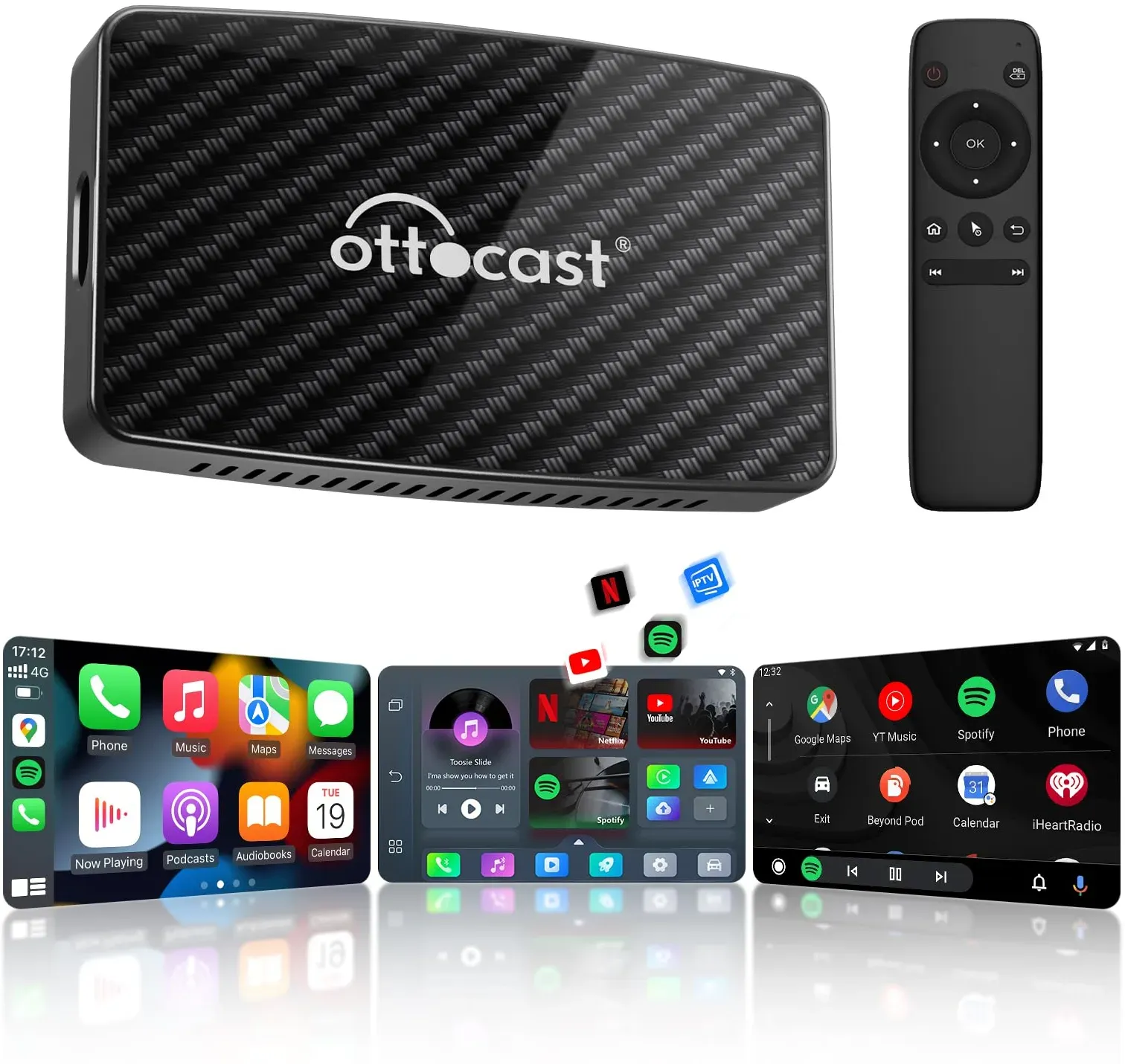 Auf Lager Versand durch AmazonOttocast Play2Video Pro, kabelloser CarPlay- & Android Auto-Adapter für Fahrzeuge mit werksseitigem kabelgebundenem CarPlay, 2-in-1 AI-Multimedia-Box mit vorinstalliertem Netflix, YouTube, Prime Video